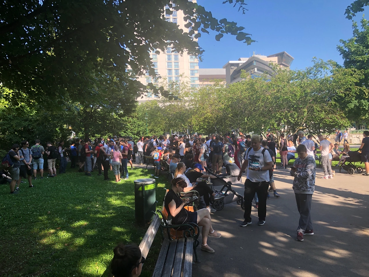 그리고 얼마 후, 한 달에 한번 열리는 커뮤니티 데이가 있었다. 비엔나에 오래 거주했던 지인 J가 커뮤니티 데이에는 Staat Park에 모든 포고인들이 모인다고 해서 나도 갔다. 그날 수천 명의 비엔나 포고인들이 그 공원에 모여 향로와 루어 모듈을 켜고 세 시간 동안 쏟아져 나오는 그날의 몬과 색이 다른(영어로는 Shiny, 일본어로는 이로치) 그날의 몬을 잡는다. 서로 누가 많이 잡나 내기를 하는 것처럼 경쟁적이다. 서울에서도 보지 못한 진기한 광경에 입이 딱 벌어진다. 심지어 내 숙소 근처에서 가끔 보던 현지인 친구들을 만나 반갑게 인사를 하기도 하였다. 가장 인상적인 그날의 장면은 벤치에 나이 지긋한 노부부가 나란히 앉아 몬을 잡는데 열중하고 있는 모습. 그리고 네 개의 폰을 담은 틀을 들고는 동시에 이 폰 저 폰 연신 커브볼을 날리면서 몬을 잡는 오타쿠. 그날도 그렇게 포켓몬고로 하나가 되었다.