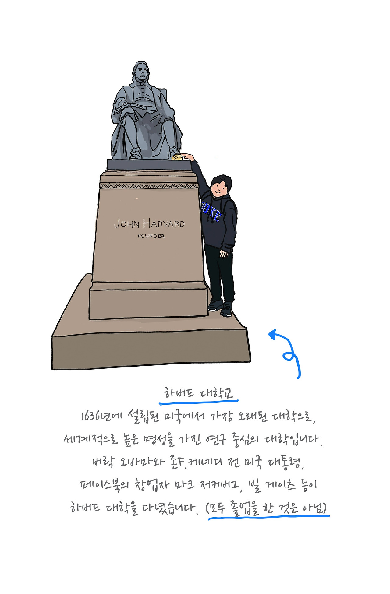 우리 가족이 매사추세츠에서 첫 번째 목적지로 정한 곳은 하버드 법대에 가는 것이에요. 그래서 보스턴 공항을 선택한 것이었지요. 저는 몇 년 전부터 미국 변호사가 되는 것이 꿈이었는데, 그 방법으로 하버드 법대를 가고 싶다는 생각을 하게 되었어요. 미국 변호사가 되고 싶다고 하면 모두가 다 하버드 법대가 제일 좋다고 이야기하기 때문이에요. 사실 내가 살고 있는 동네 근처의 스탠포드 대학이 더 좋은 느낌이지만… 그래도 최고의 대학 하버드 법대에 도전하고 싶어요. 하버드 캠퍼스에 도착해서 이번에는 공항에서와는 달리 운이 좋게 아주 적당한 곳에 주차 자리를 찾았어요. 아빠하고 탁구도 치고, 하버드 아저씨 동상의 발을 만졌어요. 아저씨 발을 만지면 하버드 대학교에 다시 오게 된다는 속설이 있다고 하던데 그럼 저도 다시 오겠지요? 그때는 눈이 쌓인 모습을 보고 싶어요.