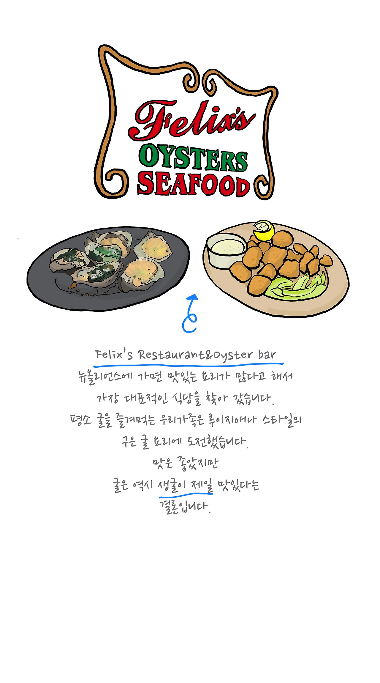 큰 사이즈의 굴 구이, 악어튀김, 검보, 그리고 루이지애나 소스까지! 루이지애나에서 이곳의 음식을 먹으니 흥이 많은 유쾌한 사람이 된 것처럼 기분이 좋았어요. 악어튀김을 용감하게 주문하고 속으로는 무서운 악어모습을 내가 마주할 수 있을까 걱정이었는데, 작은 토막을 낸 튀김으로 나와서 약간 실망했어요. 하지만 맛을 즐기기에는 좋았어요.