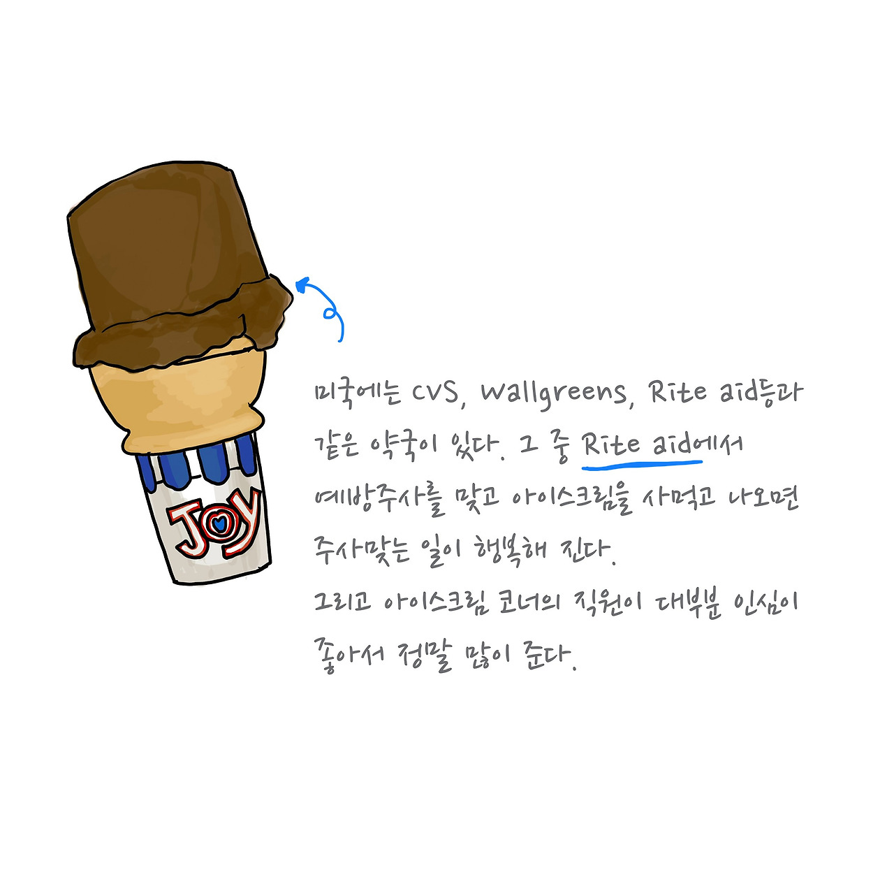 우리가 처음 이사 왔을 때 라이트 에이드약국의 맛있고 양이 많은 아이스크림을 알려줘서 그때 기억을 떠올려 아이스크림 디저트를 먹기로 했어요.