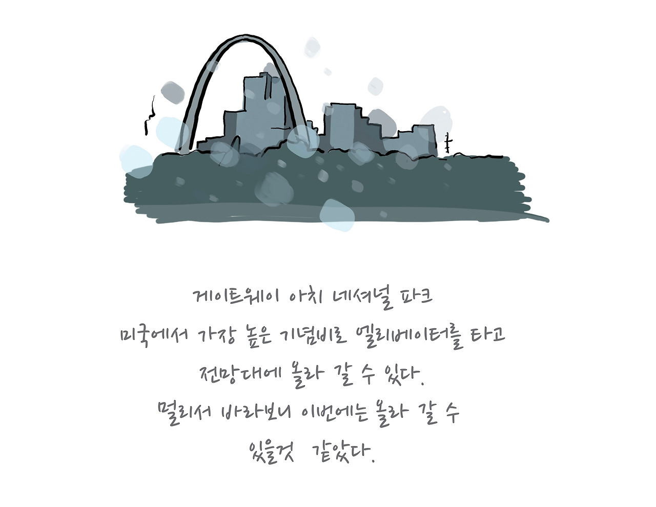 미주리주의 세인트 루이스에 도착했어요. 이곳에는 아주 큰 아치모양의 건물 ‘게이트웨이 아치’가 있다고 해서 구경을 가기로 했어요. 엄마는 이 건물에 올라갈지에 대해 나에게 결정권을 주셨지요. 그래서 저는 올라가지 않겠다고 결정을 내리고 출발했어요. 건물의 외관을 감상하는 것도 의미가 있으니까요……. 가는 길에 갑자기 비가 오기 시작했어요. 쏟아지는 폭우에 고속도로가 점점 물에 잠기기 시작했는데 생각보다 물속으로 차가 들어가는 상황은 공포스러웠고 평소에 좋아하던 빗소리도 무섭게 들렸어요.