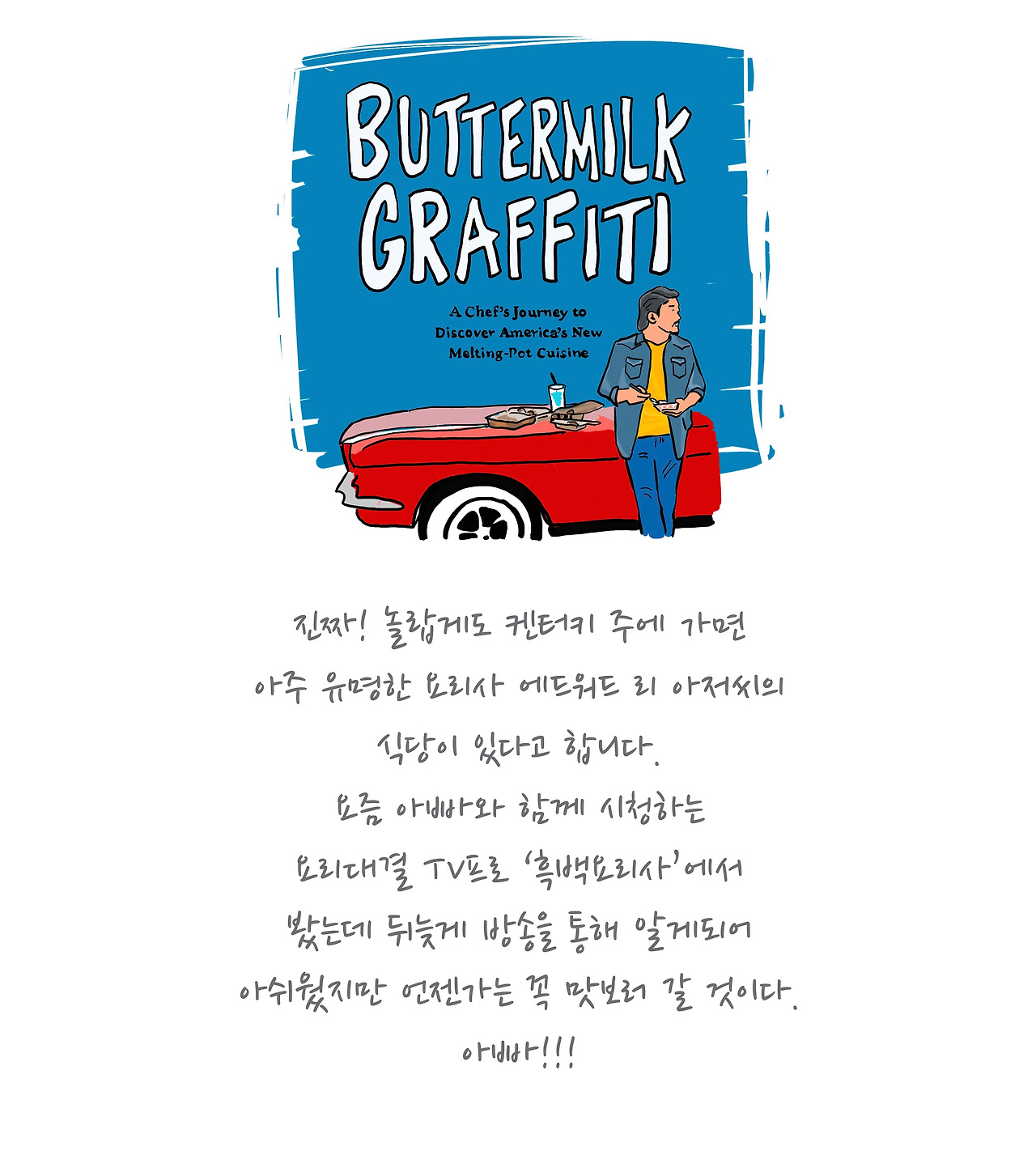 이라는 노래를 들어 본 적이 있나요? 엄마는 켄터키로 향하기 전부터 이 노래를 불렀고 아빠는 너무 즐거워하며 함께 따라 불렀어요. 어리둥절하는 나에게 오더니 노래를 부르면서 내 볼을 손으로 칼질하다가 빠밤 부분에서는 이마를 톡! 치며 끝냈어요. 무방비 상태로 당했지만, 어쩐지 마음에 드는 멜로디로 켄터키에 있는 내내 나도 흥얼거렸어요. 켄터키주에서는 무얼 할까 고민하다가 엄마가 후랑크 소시지를 먹자면서 부른 노래였어요. 하지만 아빠는 켄터키 후라이드 치킨을 먹어야 한다고 했고, 나는 KFC는 코리안 후라이드 치킨의 약자라고 우겨봤어요.
