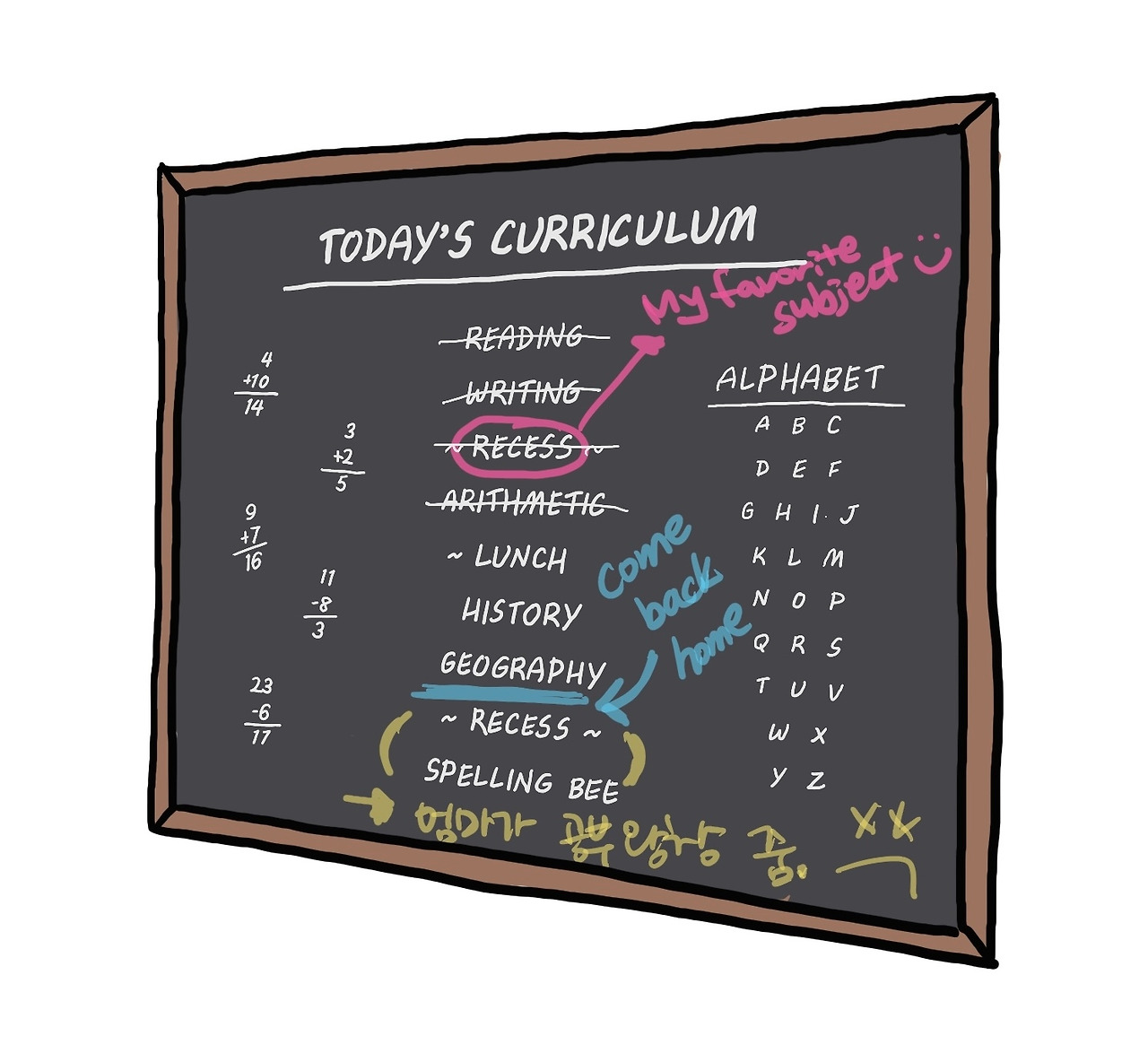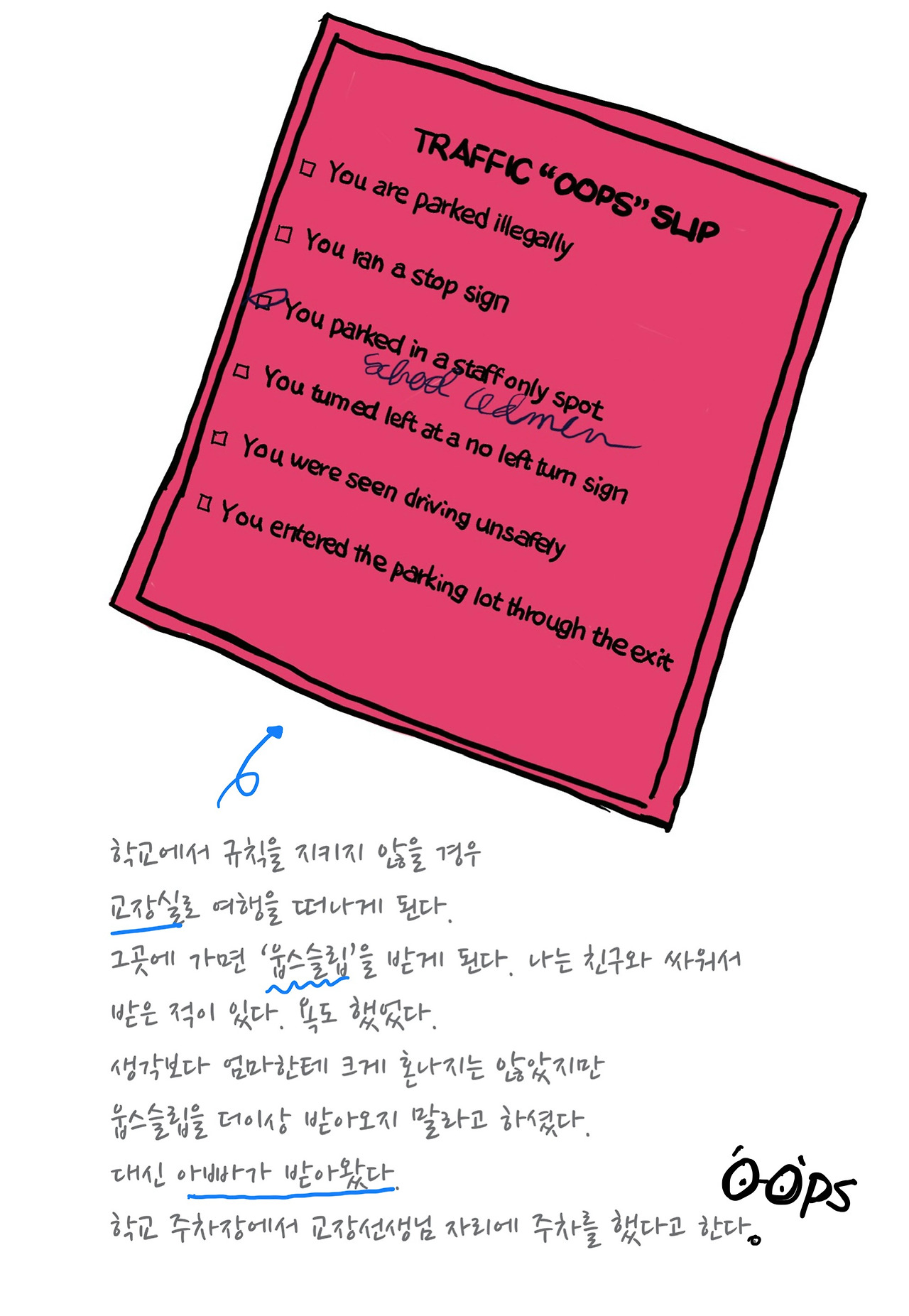 한글로 된 책만 읽어서 영문판을 읽어 보라는 엄마의 권유였지만 이번에는 흔쾌히 책을 손에 들었어요. 책 속에 끊임없이 나오는 ‘니가’라는 표현이 계속 신경 쓰였지만 한편으로는 어색함 없이 재밌게 느껴지기도 했어요. 엄마도 요즘 가끔씩 저에게 놀랄만한 표현을 쓸 때가 있어요. (저는 나쁜 말이라고 생각했지만 엄마는 그렇지 않다면서 국어사전에 등재되어 있는 표현이라고 찾아 주셨어요) 그리고 사실 저도 학교에서 종종 욕을 하긴 해요. 잘못이라는 것을 알고 있고, 실제로 교장실에 가서 Oops slip을 받기도 했지만 욕을 하는 것이 크게 이상하지 않을 때가 있거든요.