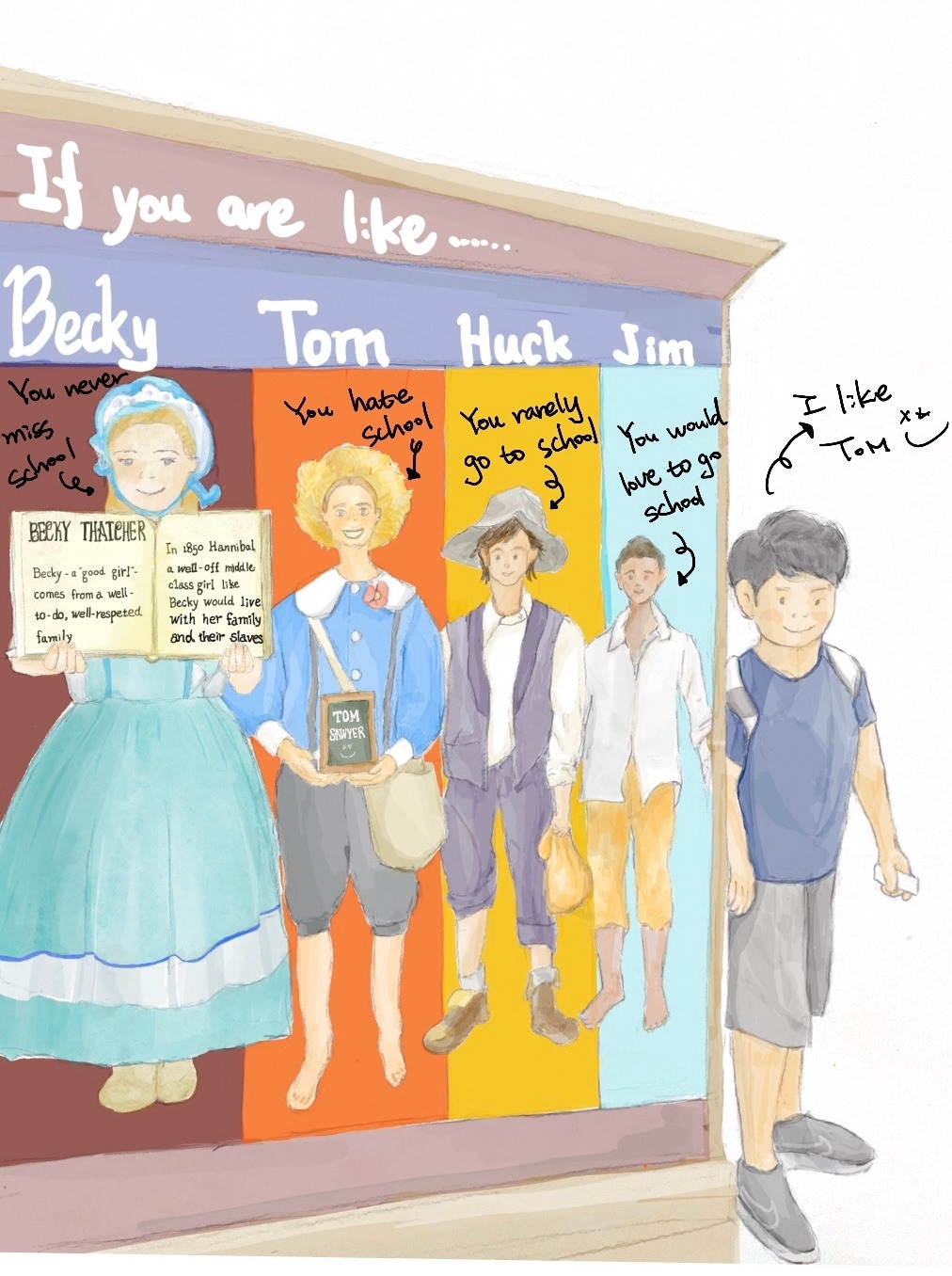 엄마가 짐에 대해 물어보는데 저는 학교를 다닐 수 없던 짐이 부럽다고 이야기했어요. 물론 차별을 받고 힘든 일을 해야 했겠지만 학교보다는 낫지 않을까?라는 생각이었어요. 등장인물들의 모습을 보다 보니 우리 교실 안에 있는 친구들이 떠올랐어요. 기가 막히게 이미지가 맞는 친구들을 찾아낼 수 있었지요.