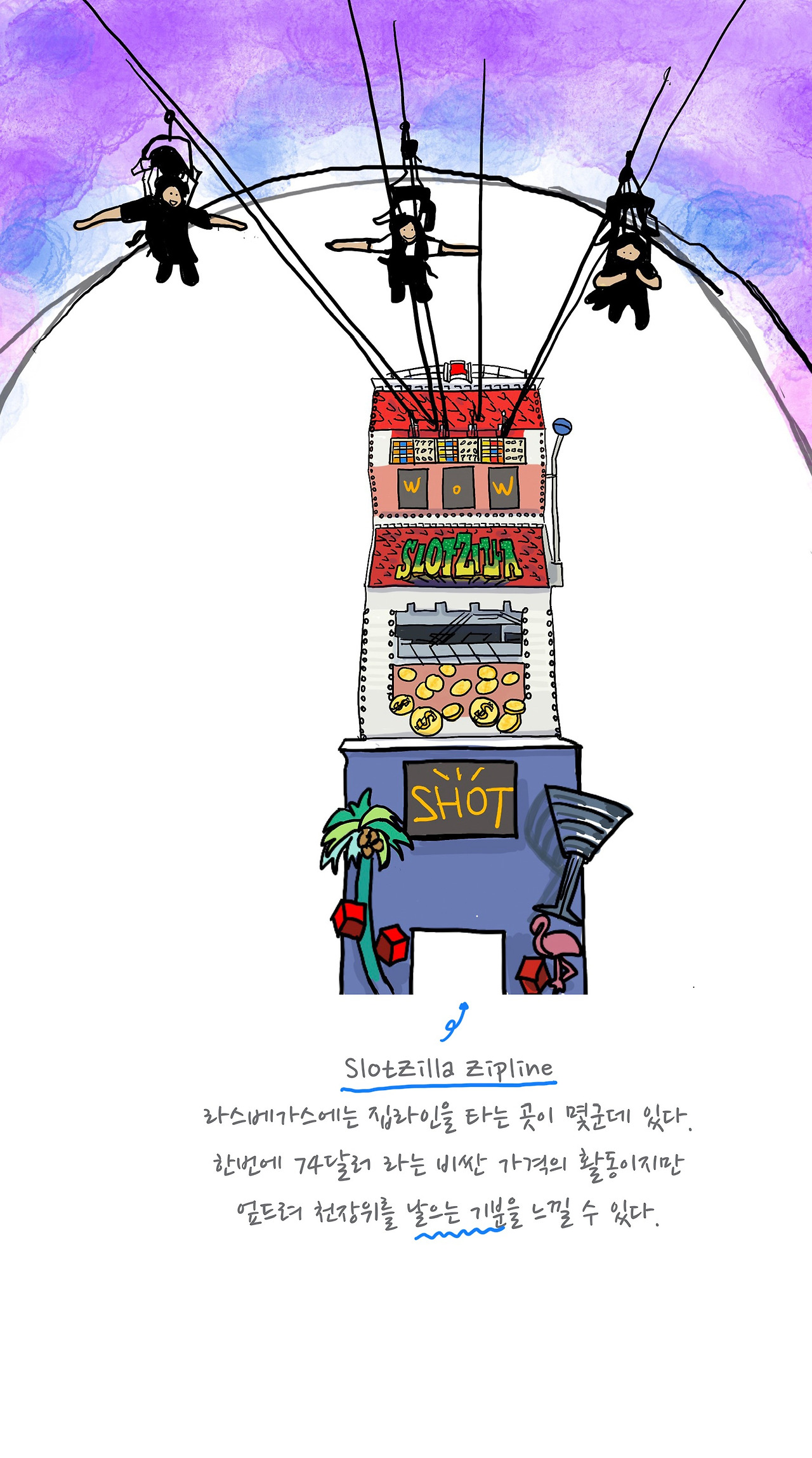 집라인을 탄 일이에요. 타워의 꼭대기까지 올라가서 슈퍼맨처럼 엎드려, 쇼핑 몰을 날아가는 것이었어요.