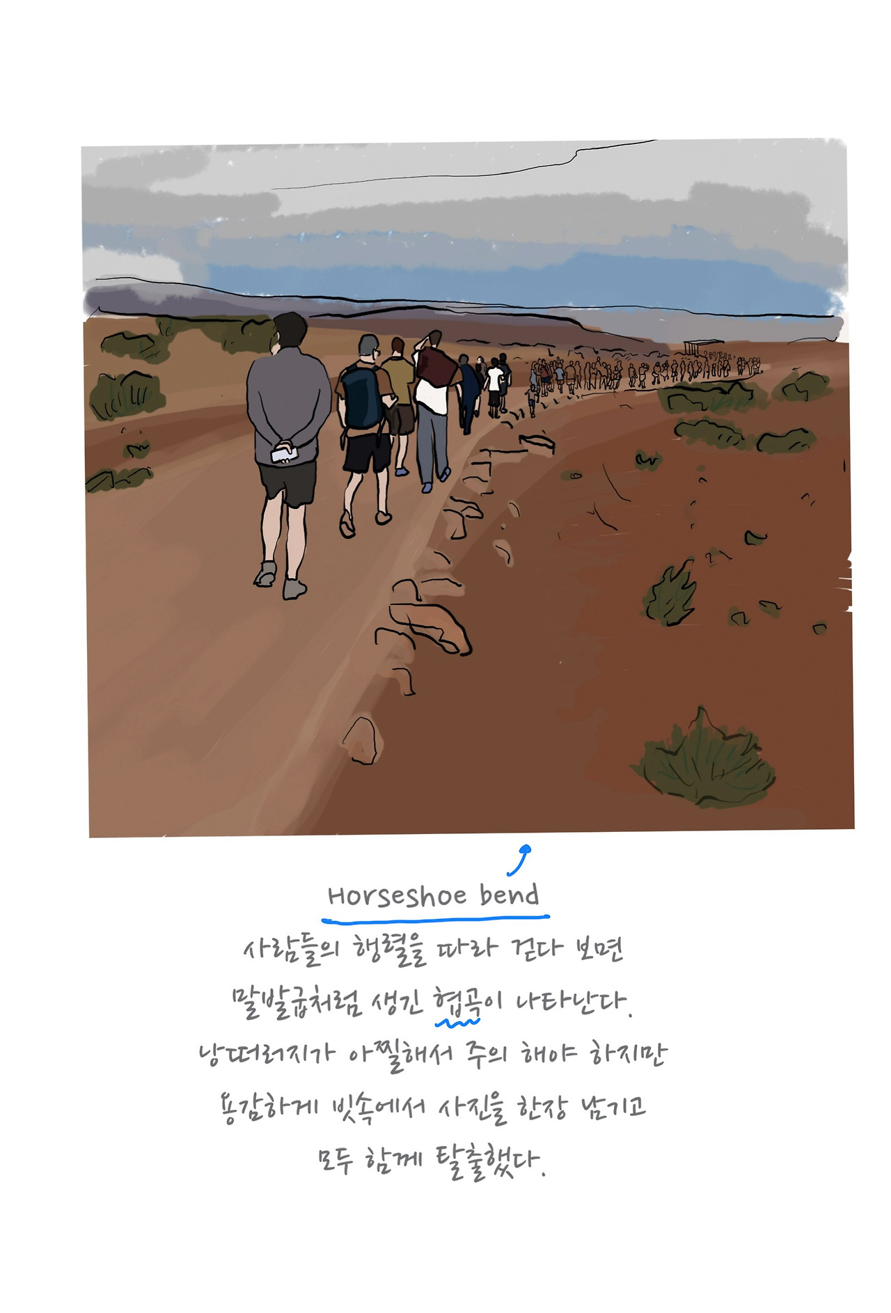 마지막 코스로 홀스슈밴드를 보러 갔는데 큰 차를 타고 가서 주차비를 비싸게 내야 했어요. 그리고 도착해서 경치를 감상하려는 순간 갑자기 비가 쏟아지고 번개가 치기 시작했어요. 함께 걸어가면서 구경하던 사람들이 일제히 주차장을 향해 도망쳐 나왔어요. 마치 전쟁영화 속의 피난길 같았어요. 그 길을 형이 먼저 앞서 갔는데 멀리서 이모, 누나와 함께 주저앉아 있는 모습이 보여서 엄마와 저는 놀라서 달려갔지요. 상황은 비 때문에 미끄러워진 슬리퍼가 발 깊숙이 들어가 슬리퍼를 빼주기 위해 이모가 애를 쓰고 있었고, 모두 제자리를 찾아 마침내 무사히 차로 돌아올 수 있었어요. 정말 엄마 말대로 환장할 일이 많은 애리조나 주였어요.