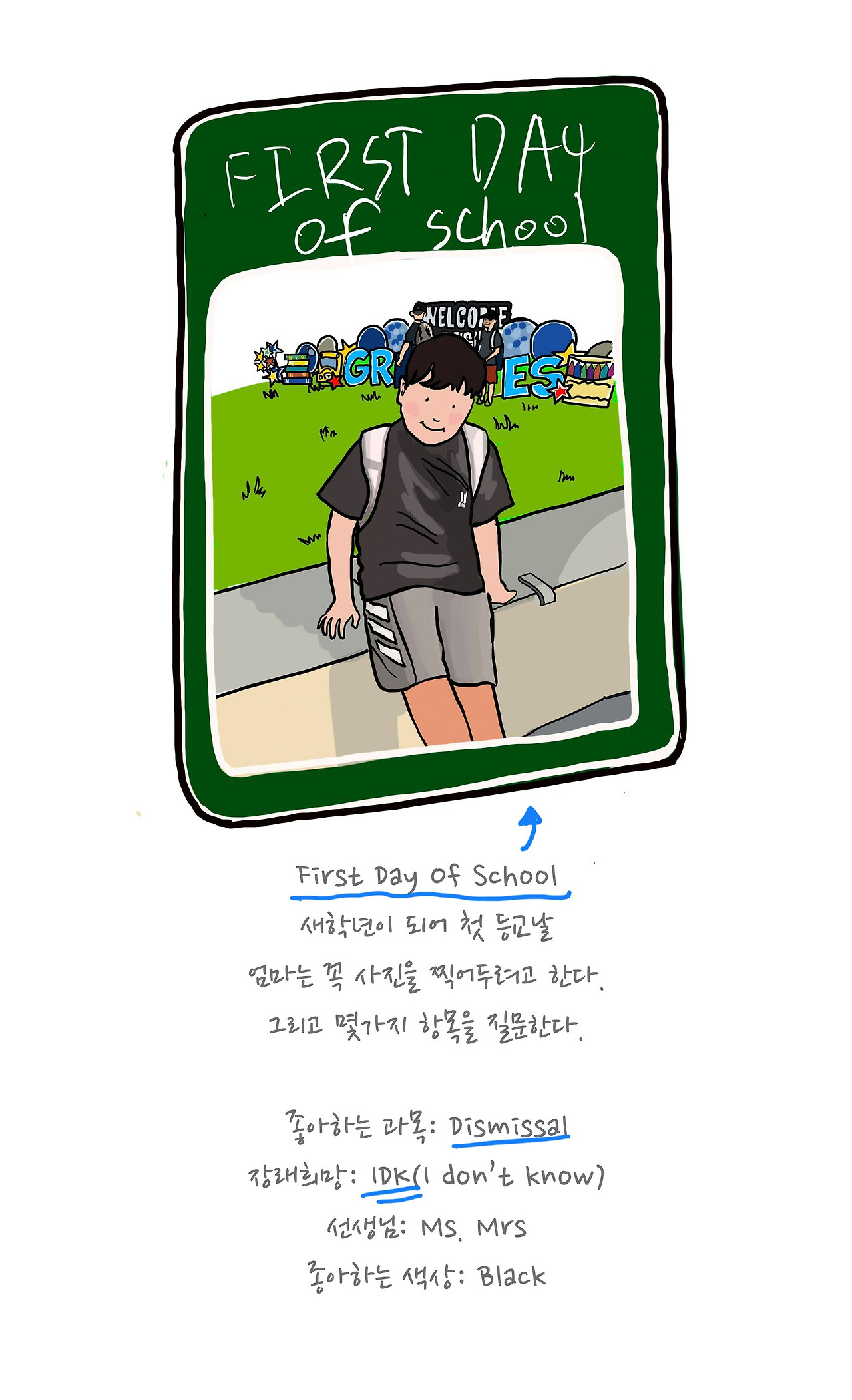 3학년이 되면서 학교를 옮기게 됐어요. 제가 미국으로 이사 왔을 때는 집 앞의 학교가 더 이상 전학생을 받지 않아서 좀 멀리 있는 학교를 다녀야 했거든요. 첫 학교에서 친구도 사귀고, 이제는 전교생 얼굴이 익숙해졌는데….. 처음에는 “Blue hoodie”로 불리다가 학기를 마친 지금은 내 이름으로 불리는 위치까지 왔는데……. 또다시 새로운 곳에서 시작을 해야 한다니……. 기분을 무겁게 만들었지만 엄마는 선택할 수 없는 일이라고 하셨어요. 평소와는 달리 단호한 엄마의 대답이었기 때문에 받아들이기로 했어요.