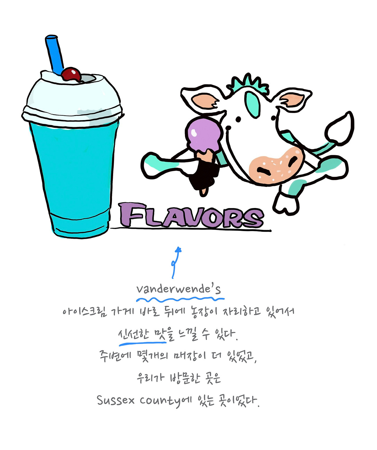 다음날 아빠는 엄마가 가고 싶은 곳을 들르기로 약속하고 출발했지만 엄마가 그토록 가고 싶어 했던 앤티크 가게는 이번에도 모두 지나치고 아이스크림 가게 앞에는 순발력 있게 멈췄어요. 엄마가 아빠에게 운동신경이 둔해 차를 멈추지 못했다고 핀잔을 주었던 것이 무색해질 만큼 아빠는 잽싸게 아이스크림 농장 앞에 주차를 하셨어요. 쌀쌀한 날씨 탓에 아이스크림 가게가 한산해 보였지만 우리가 사진을 찍는 사이 여러 대의 차가 드나들었어요. 대부분의 차에서 내린 손님들은 할머니, 할아버지였어요. 우리 할아버지도 아이스크림을 좋아하시는데……. 아마 제일 큰 어른이 되면 허락받을 필요 없이 아이스크림을 먹을 수 있어서 할머니 할아버지들은 아이스크림을 좋아하시는 걸까요? 싱글콘의 사이즈가 어마어마하게 컸지만 모두 하나씩 들고 나오셔서 차 안에서 드셨어요. 저도 당연히 한 개의 아이스크림을 혼자 먹고 싶었지만 엄마는 우리 셋이 두 개면 충분하다고 하셨어요. 하지만 이럴 때도 저만의 방법이 있어요. 저는 아이스크림 대신 셰이크 메뉴를 시켰고 엄마와 아빠는 아이스크림 메뉴가 통일이 잘 안 되기 때문에 결국 3 스쿱의 중간사이즈 아이스크림을 시켰어요. 결론적으로 싱글 1개씩 주문한 양 보다 많은 양의 아이스크림을 3명이 먹은 셈이지요. 제가 생각해도 저는 참 똑똑해요.