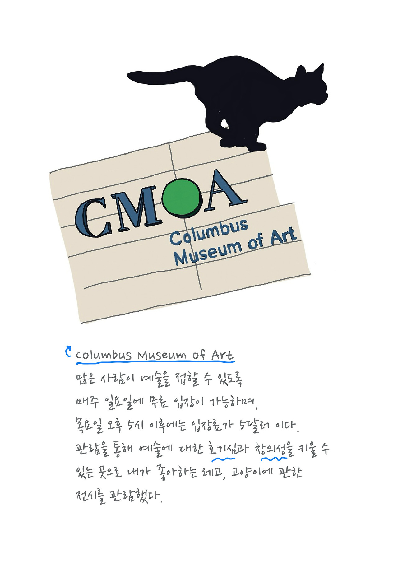 미술관 관람을 하기로 했는데 엄마 평에 의하면 “너무 진지 하지 않고 젊은이들의 감성과 도전정신이 살아있다”는 곳이었어요. 무슨 말인지 이해가 되지는 않아요. 예전에 피츠 버그에서 앤디워홀 미술관을 재미있게 관람한 뒤로 여행할 때마다 미술관 관람을 즐기게 되었는데 가끔씩은 지루하기도 하지만 콜럼버스의 미술관은 내가 즐기기에 딱 좋은 미술관이었어요.
