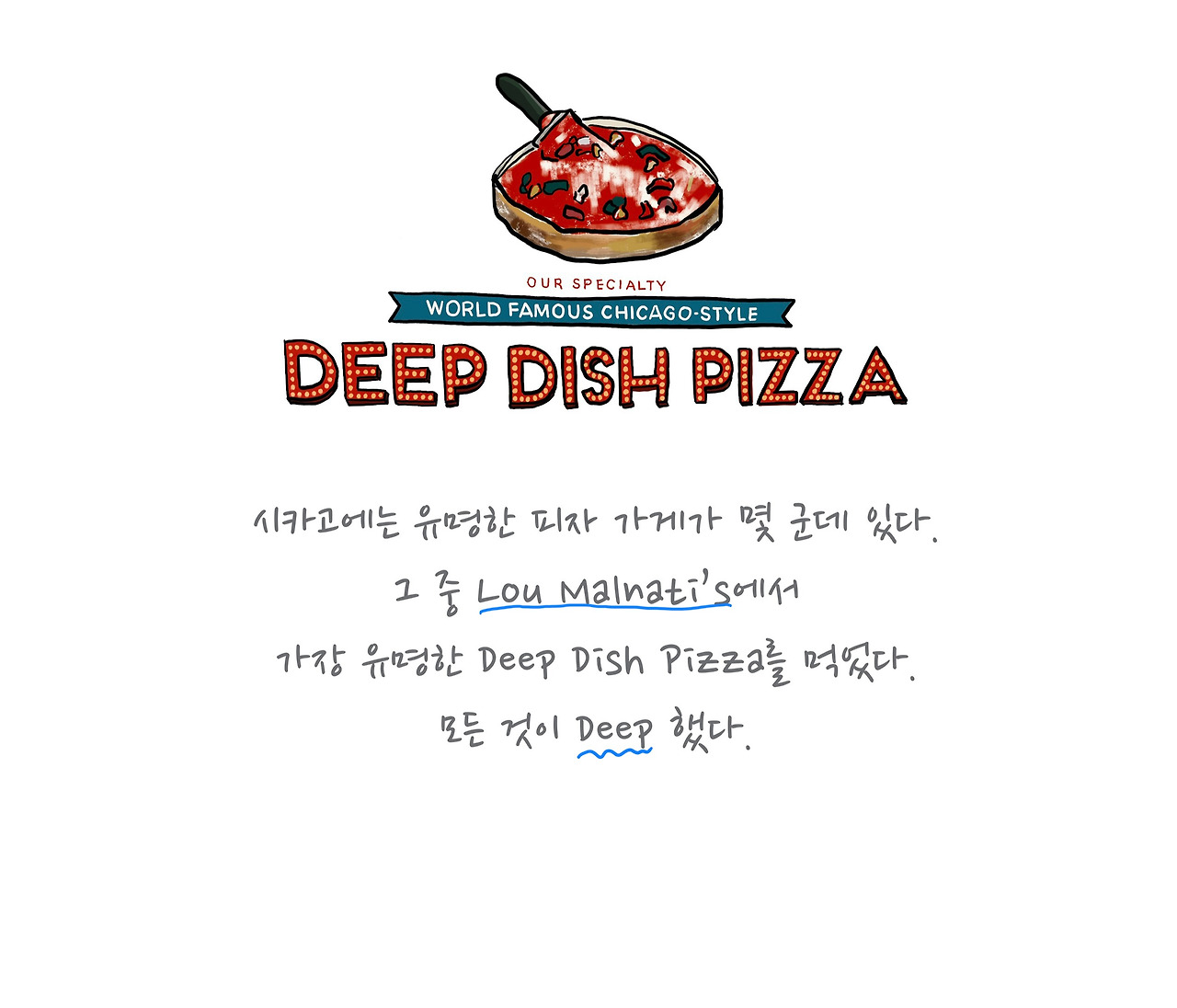 비를 뚫고 점심으로 자리 잡은 식당은 시카고 피자! 시카고 딥 피자는 워낙 유명해서 기대가 컸지만 토마토 맛이 너무 강해 실망도 컸어요. 하지만 의외의 메뉴를 발견한 곳이기도 해요. 이번에도 역시 아빠의 한식타임이 돌아와서 밤늦게 찾아간 곳에서 엄마는 어린 시절에 좋아했던 메뉴를 발견했어요. 이름은 “염소탕” 귀한 음식이라 자주 먹지 못했지만 어릴 적 엄마가 좋아했던 음식이라고 시키셨어요. 저는 궁금해서 한 숟가락 얻어먹었는데 멈출 수 없던 맛이었어요. 이 여행 후, 다시 먹은 적은 없지만 Goat Soup이라니, 독특하면서도 익숙한 맛이 계속 생각이 나요.