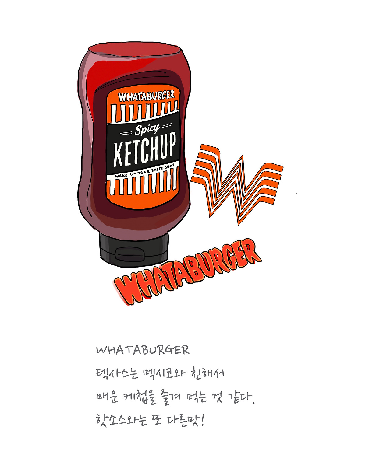 우리는 저녁으로 아빠 회사아저씨의 고교시절 단골 식당을 가기로 했어요. 그런데 어쩐지 아빠가 그냥 지나쳤어요. 아빠는 가끔 그래요. 무조건 직진이 하고 싶을 때 가 있는 것 같아요. 어느덧 텍사스의 엘패소까지 한 번에 달린 아빠는 다행히 두 번째로 추천받은 식당? “Whattabuger”가 나와서 우리는 그곳에서 햄버거를 먹었어요. 동부에는 SHAKE SHACK, 서부에는 In N Out, 그리고 남부에는 WAHTABUGER라고 해요. 이 버거가게의 특징은 매운 케첩이 있다는 것이에요. 이 근처가 고향인 아저씨는 아직도 아마존에서 매운 케첩을 주문해서 드신다고 꼭 맛보라는 추천을 받은 곳이에요. 감자튀김도 맛있고 두툼한 고기의 햄버거 맛도 좋았어요. 하지만 역시 최고는 추천대로 케첩이었어요!