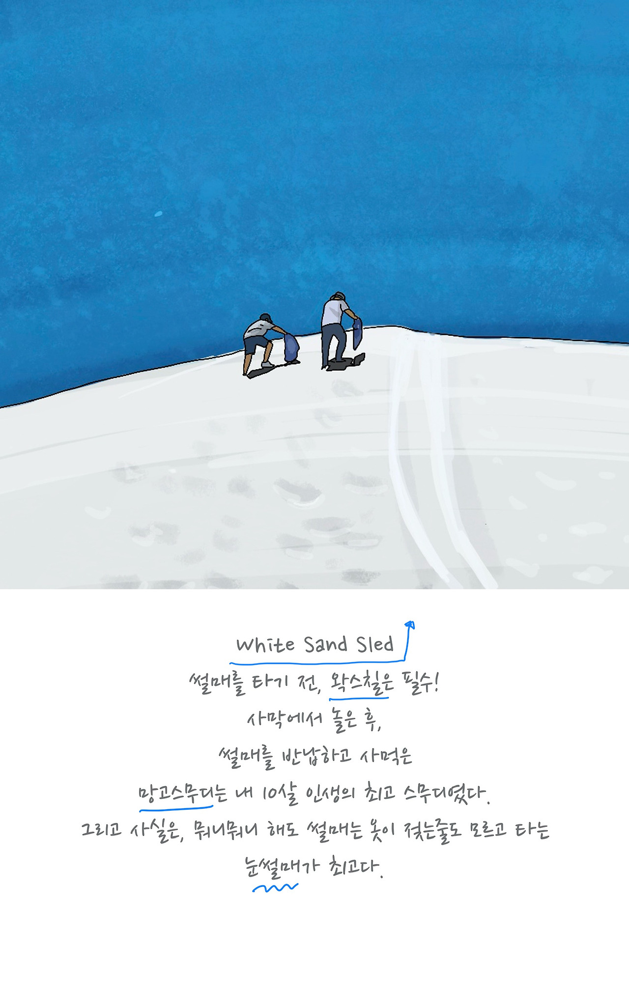 이번 여행의 첫 목적지인 화이트샌즈 국립공원에 도착해서 가장 먼저 방문센터에 들렀어요. 썰매를 빌리기 위해서 에요. 사촌동생의 추천대로 썰매를 빌려 국립공원을 투어 하기로 했거든요. 듣던 대로 적당한 언덕을 찾아 썰매를 타고 내려오면 눈 없이 눈썰매를 타는 것과 똑같이 됐어요. 하지만 동생의 추천보다 저를 더욱 사로잡은 것은 새하얀 모래였어요. 모래놀이에서 둘째가라면 서러울 정도로 모래를 좋아하는 나! 생수병을 들고 모래조각을 만드는 동영상을 찍어 동생에게 보내줬어요. 해도 해도 재미있는 모래놀이. 어릴 적에 엄마가 사주셨던 촉촉이 모래 같았어요. 앉아서 하염없이 모래를 파는 것이 제일 좋아하는 작업인데 이곳의 모래는 팔 수록 시원해지는 느낌이 정말 기분 좋게 만들었어요. 모래가 공원의 이름처럼 하얀색이라 빛을 흡수하지 않아서 시원함을 느낄 수 있었거든요. 엄마는 옆에서 계속 썰매를 즐겼고, 언덕을 오르는 일이 만만치 않았던 아빠는 썰매 대신 지난번 소금사막에서의 소심한 드리프트 운전을 만회하는 방법으로 지프차를 분해하기 시작했어요. 영화에서처럼 천장과 문이 없는 차를 타고 사막을 달리는 기분을 느끼게 해 주겠다고 말씀하는 모습이 마음을 단단히 먹은 듯했어요. 한참을 셋이서 각자의 방법으로 열심히 즐기고 있는 우리 앞에 국립공원 순찰차가 멈춰 섰어요. 그리고 물을 충분히 마시라는 주의를 주고 갔어요. 사막에서 신나게 놀고 싶다면 역시 수분보충이 중요한가 봐요.