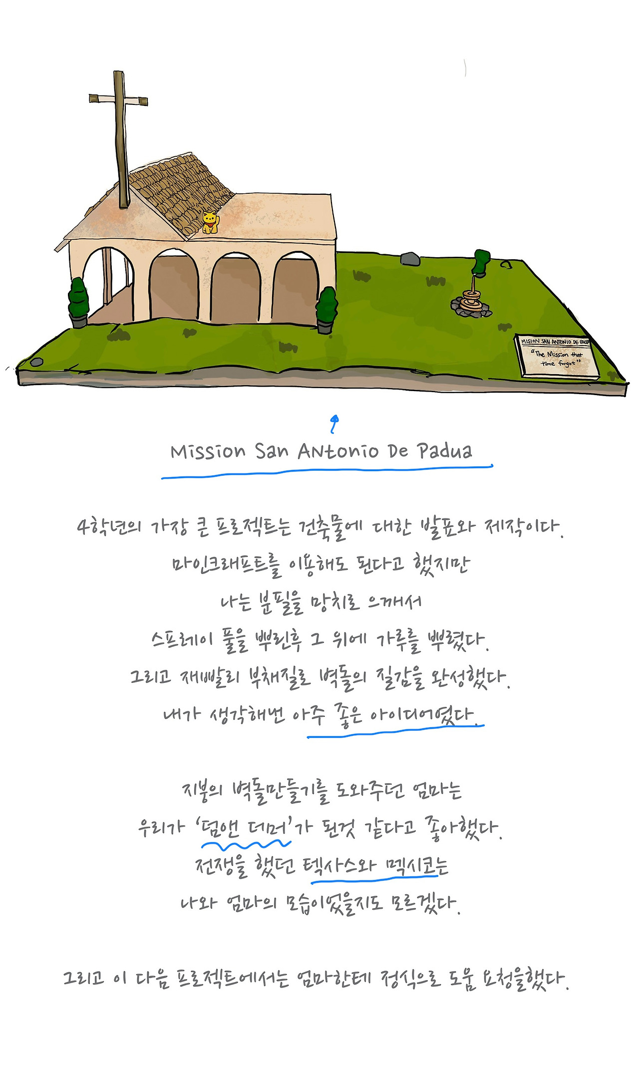 그리고 학교에서 4학년 만들기 프로젝트로 진행했던 ‘샌 안토니오 드 파두아‘와 비슷한 곳을 방문해서 미국의 역사를 볼 수 있었어요. 현재 ‘알라모’라고 불리는 곳이에요. 미국이 스페인과 치렀던 전쟁을 보게 됐는데 미국은 늘 다른 나라를 도와주기만 하고, 침략을 받는 입장은 아니라는 생각을 하고 있어서 그 모습이 낯설게 느껴졌어요. 미국도 치열하게 나라를 만들고 지켰다는 것이 새로웠어요. 누구에게나 그런 시간은 필요한가 봐요.