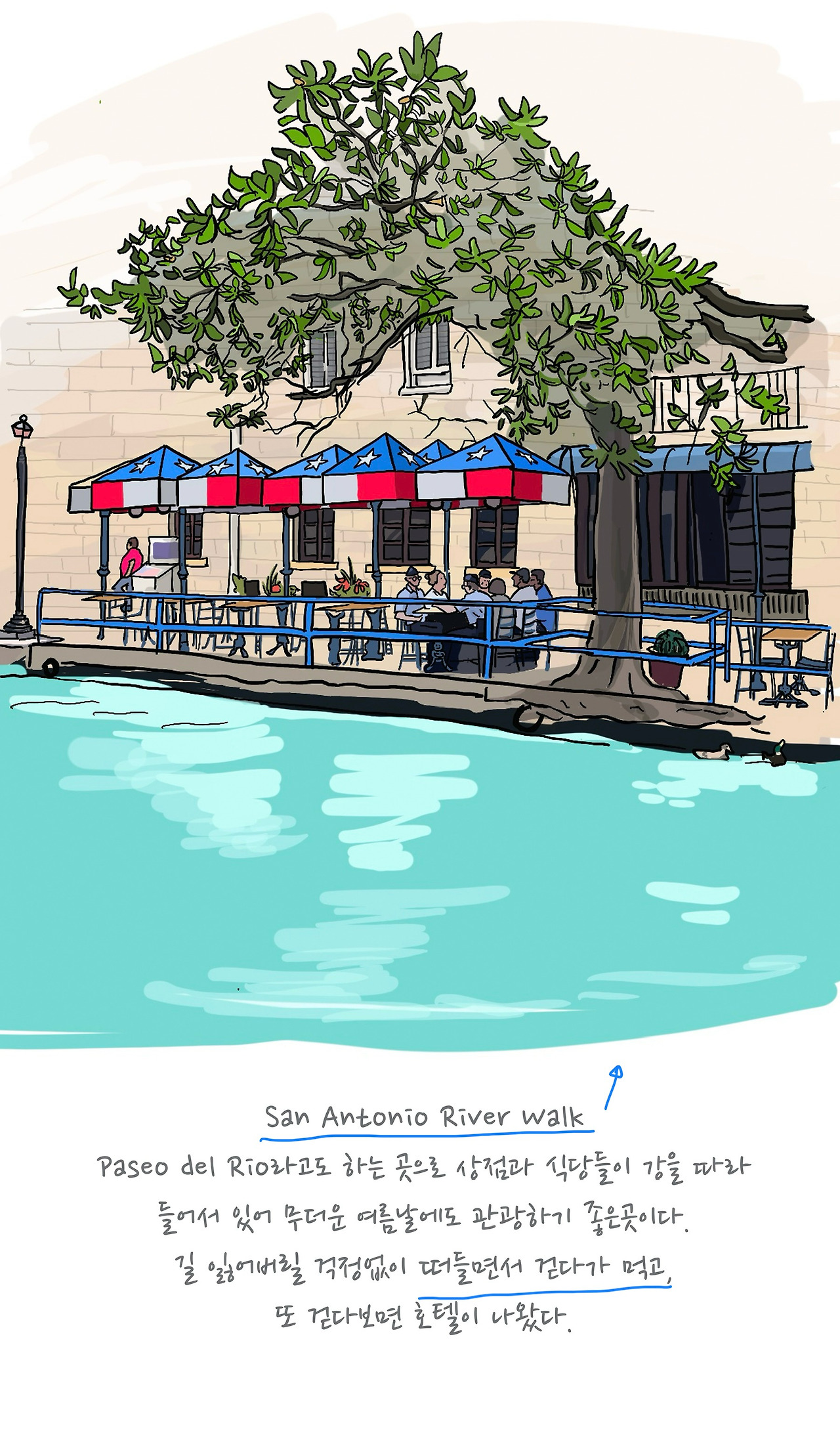 그리고 밤이 돼서는 배를 타고 리버워크를 투어 했어요. 배를 타면서 듣는 설명은 재미있었어요. 홍수를 대비해 설계된 것과 건물마다 갖고 있는 이야기, 무엇보다 여름 날씨에 걷지 않아도 된다는 것이 가장 마음에 들었어요. 배 투어를 하면서 청소를 하기 위해 이곳의 물을 뺐을 때 무려 1만 대가 넘는 휴대폰을 발견했다는 이야기를 들었는데, 그 뒤로 물속에 휴대폰이 보이나 계속 살피며 걷게 되었지요.