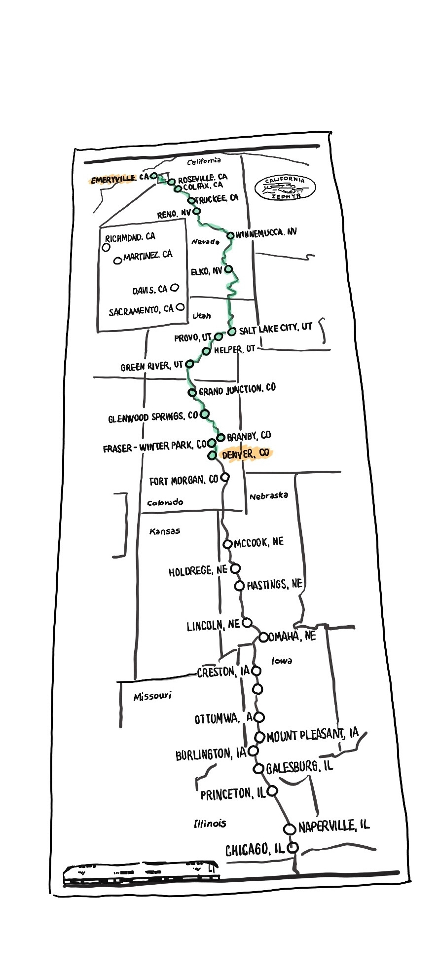 우리는 이 기차, Amtrak zephyr를 36시간 타고 덴버에 내려서 중부 여행을 시작 할 거에요. 이번에도 차를 타고 신나게 달리면서 새로운 주들을 들를 계획이에요.