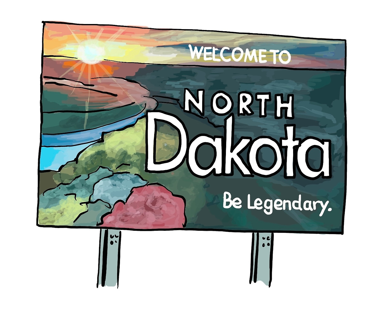 사우스 다코타에서 노스 다코타로 이어지는 풍경은 소와 밭이 전부였거든요. 이 모습이 바로 노스다코타의 상징이라는 생각이 들어서 우리도 사진을 찍기 위해 잠시 밖에 내렸는데…….. 예상하지 못했던 파리와 벌의 공격을 받아서 낭만적으로 풍경을 즐기기는 어려웠어요. 그림에서처럼 소에게 공격을 당하지 않아 다행이라고 해야 할까요?