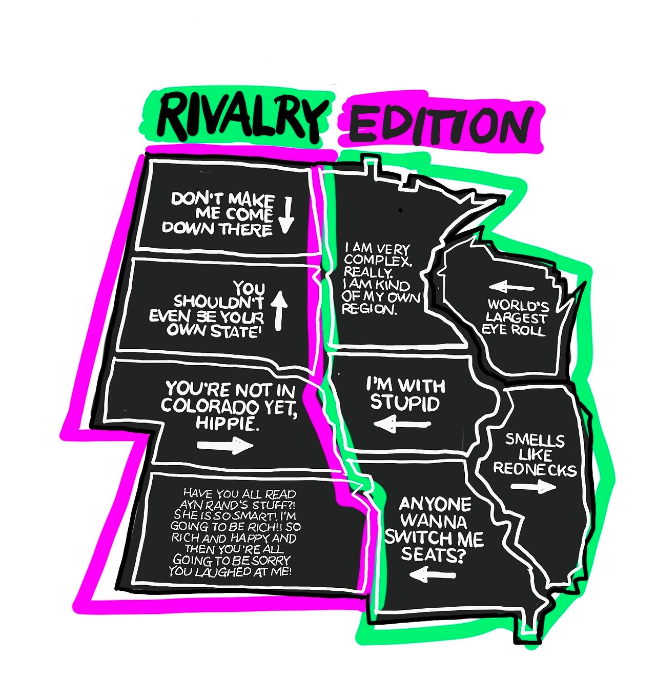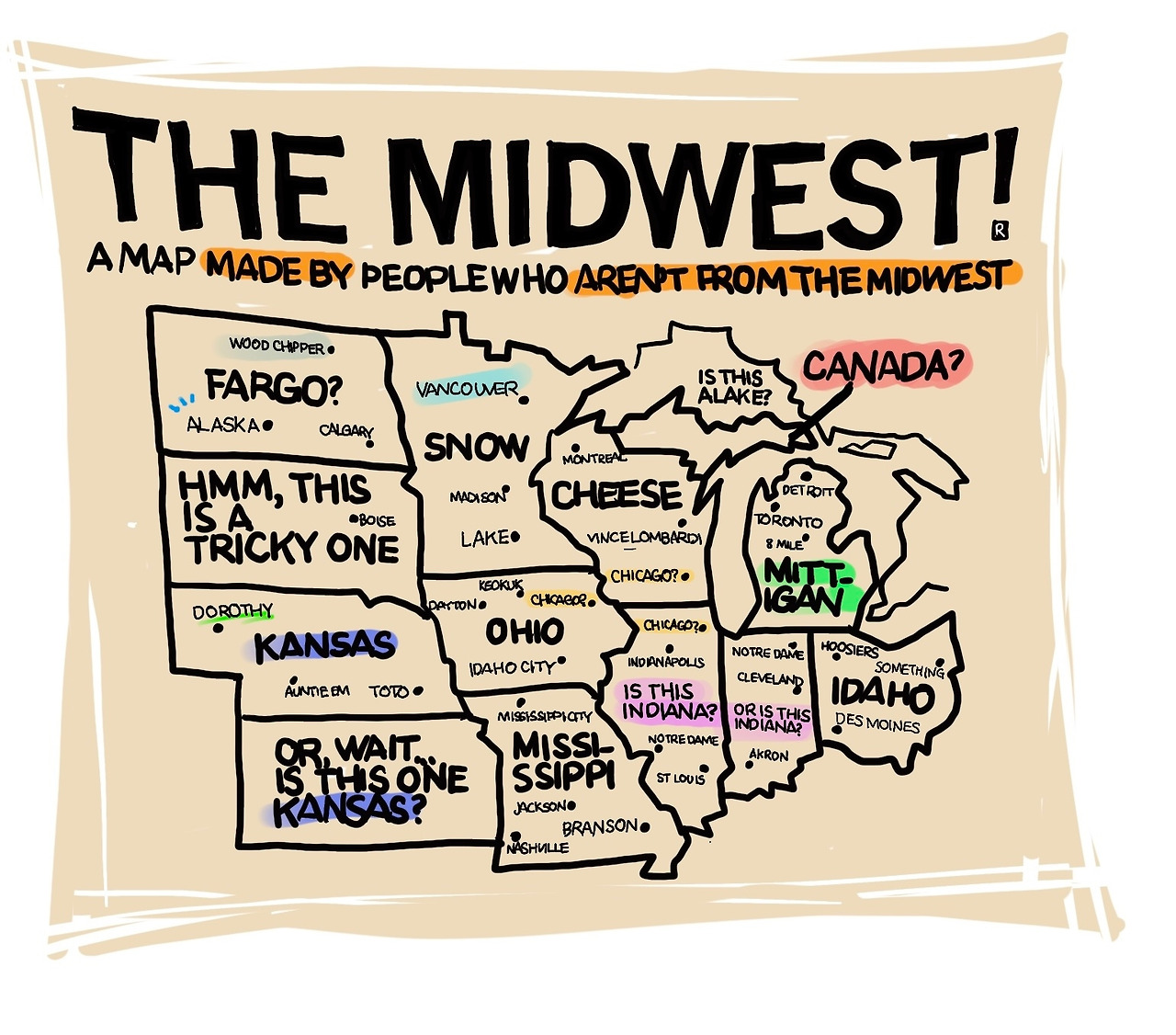 노스다코타로 올라가면서 들른 휴게소에서 재미있는 티셔츠를 발견했어요. 관광객이 소와 함께 사진을 찍으려고 하다가 공격하는 소에 들이 받힐까 놀라 도망가는 그림이 있는 티셔츠예요. 생각보다 비싼 가격 때문에 구매하지는 않았지만 계속 기억에 남아요.