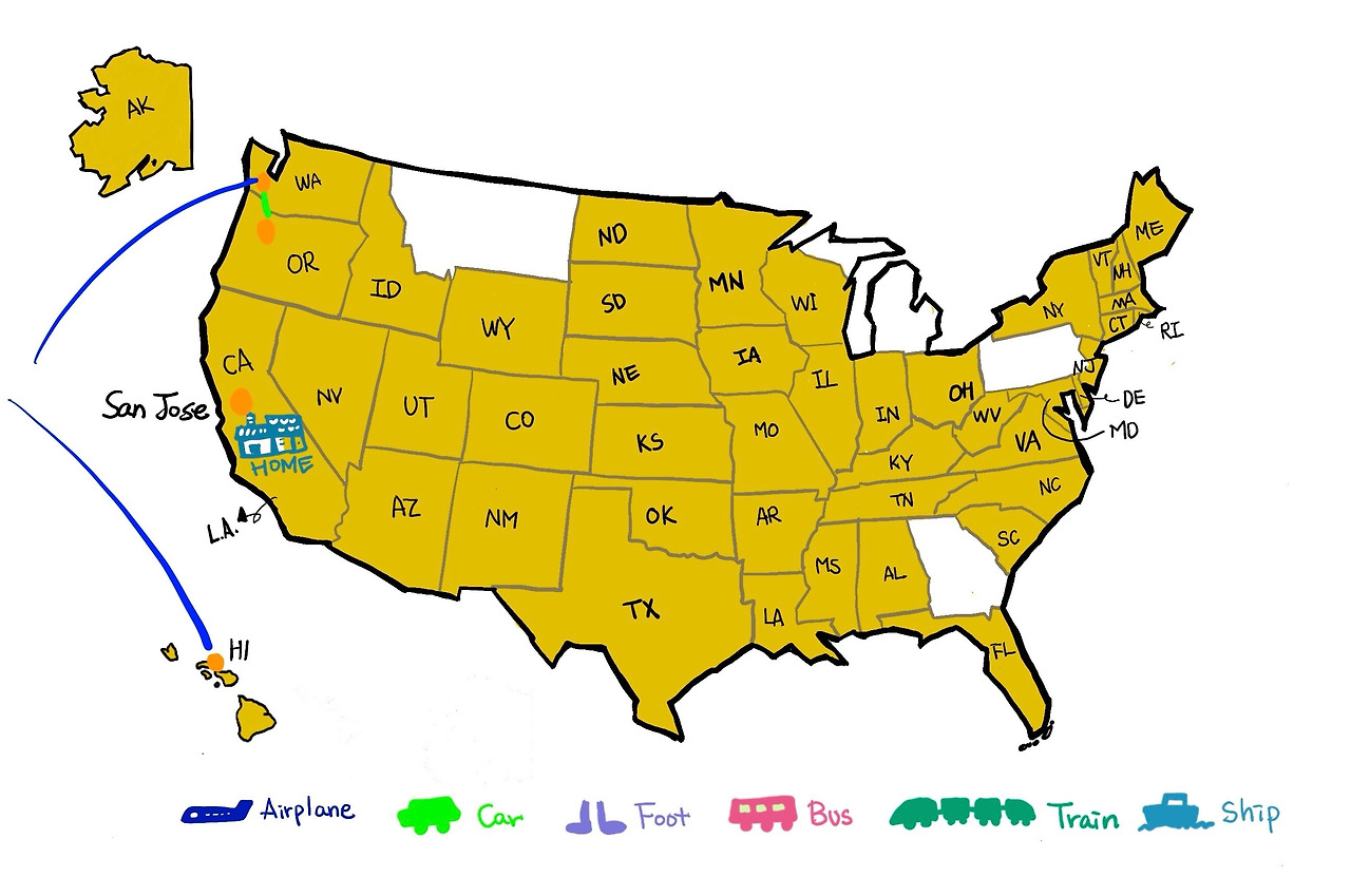지난 여행기의 지도를 살펴보면 좀 이상한 것을 발견하셨나요? 버지니아주와 워싱턴 주는 여행기가 없지만 지도에는 색칠이 되어있고, 하와이는 아직 지도에 나타나지도 않았지요.