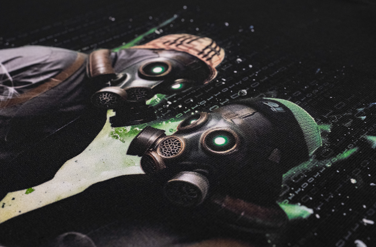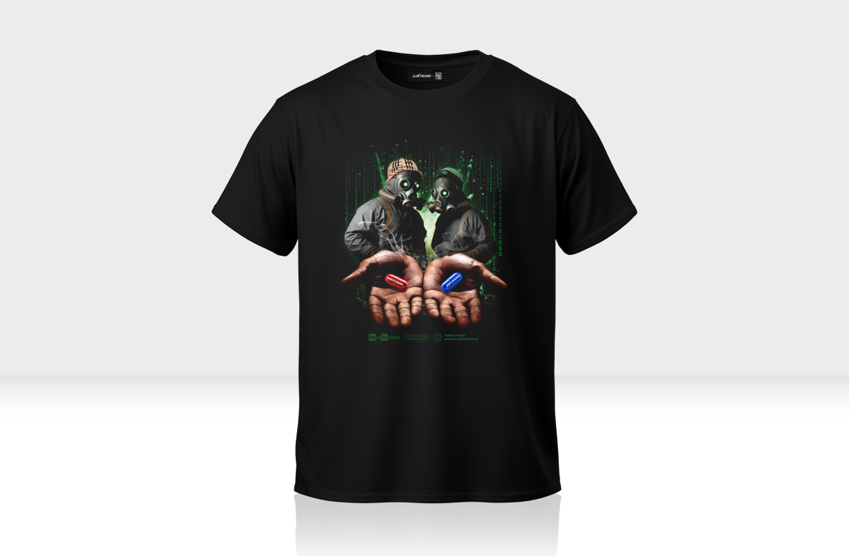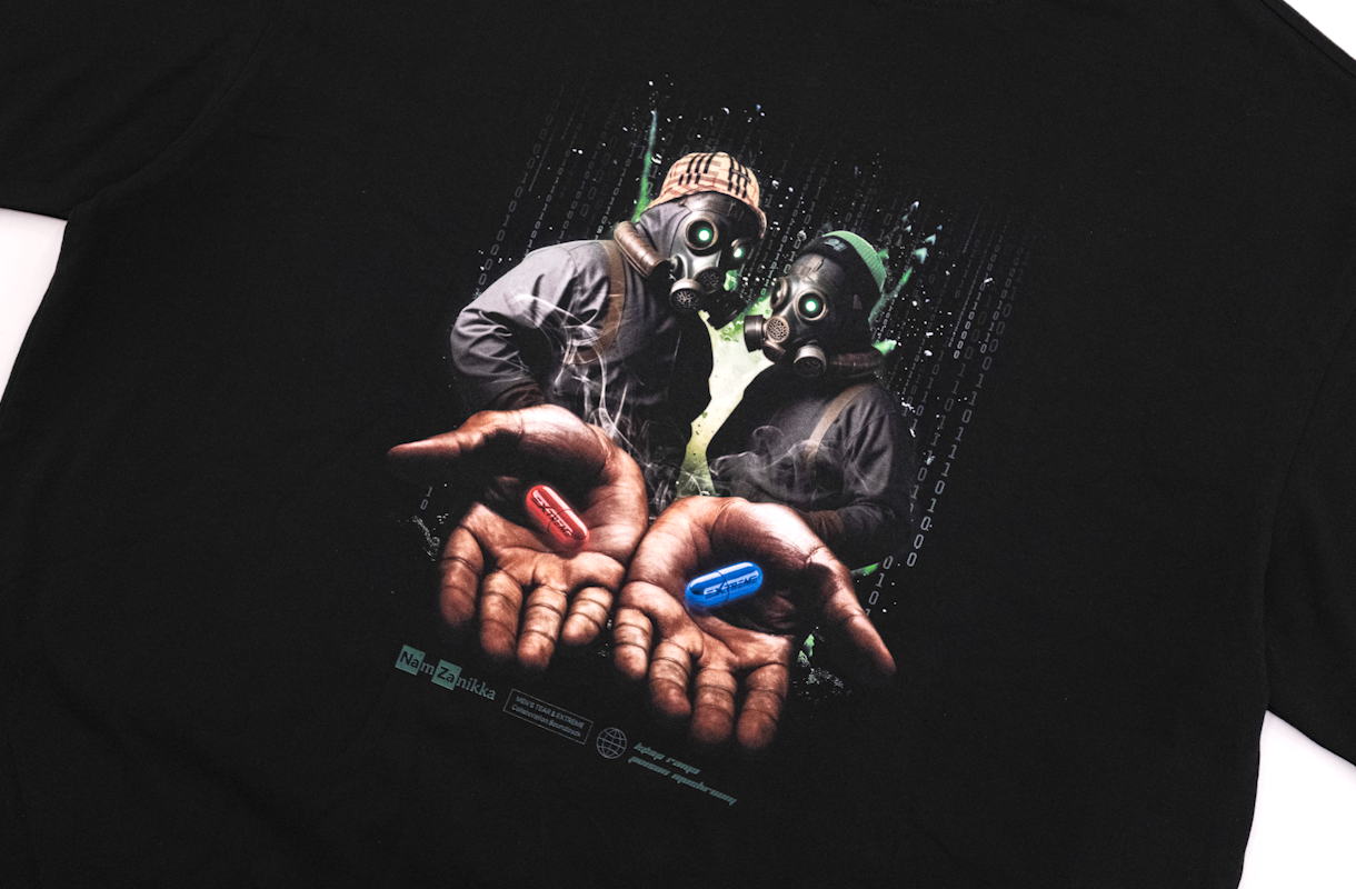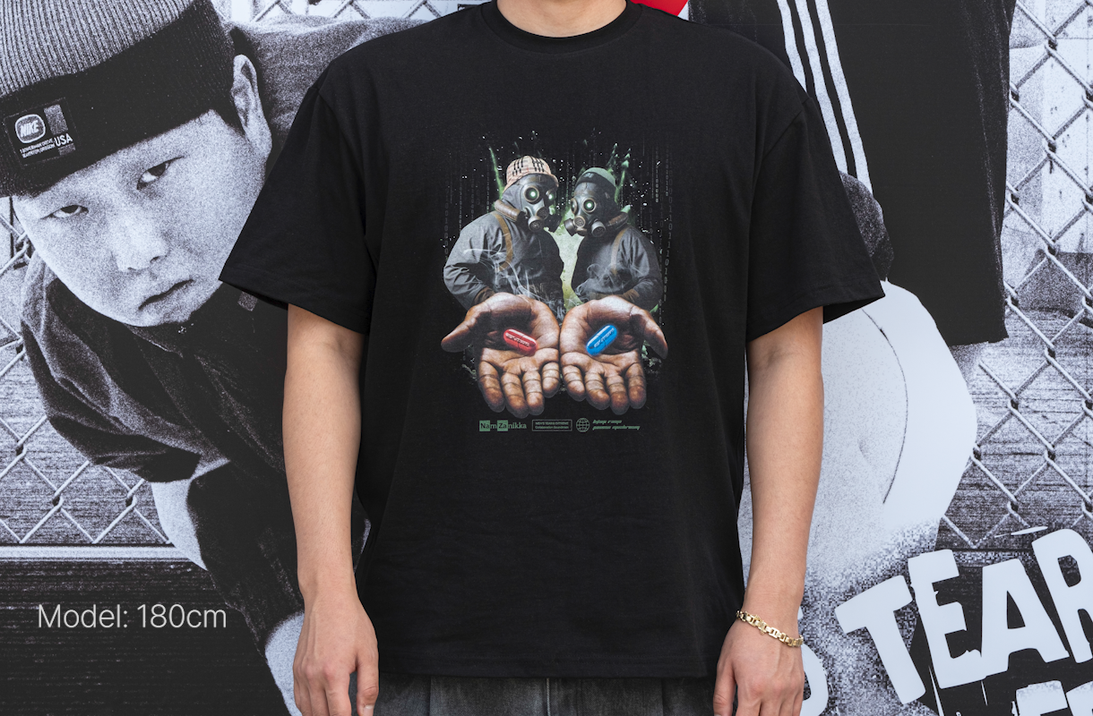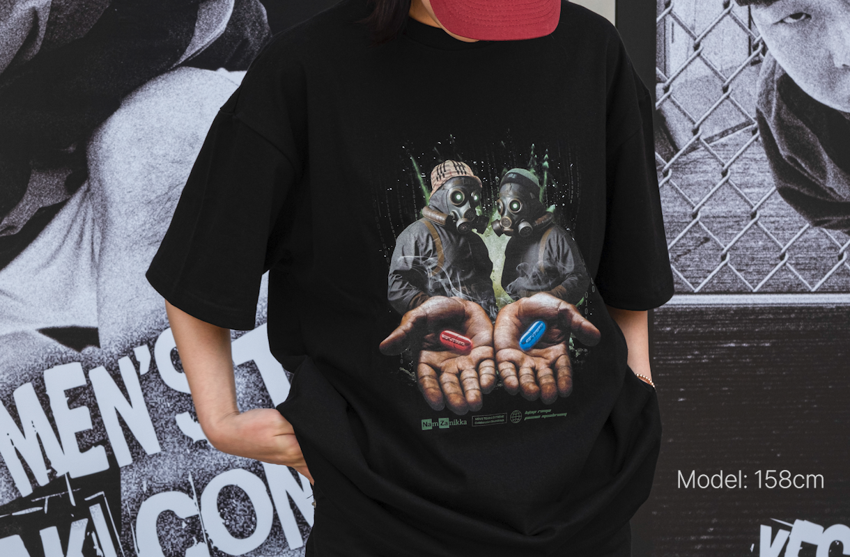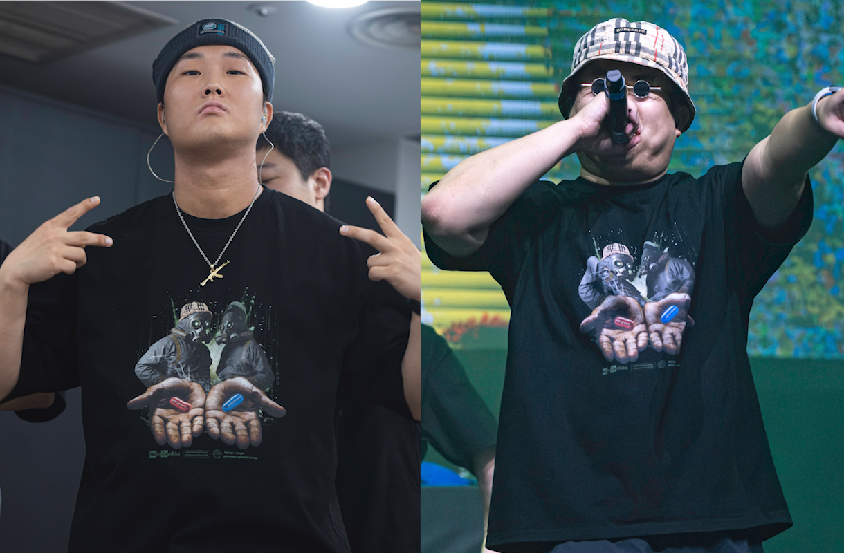 티셔츠 중앙에 알약을 들고 있는 두 인물이 눈에 띈다.