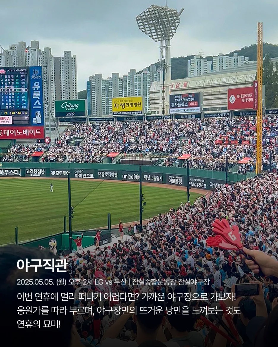 연휴지만 멀리 떠나기 어렵다면? 가까운 야구장으로 여행을 떠나보자. 이번 5월 5일 오후 2시에는 LG와 두산의 경기가 펼쳐진다.