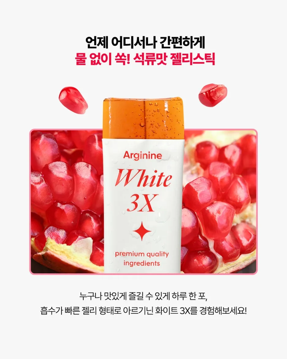 여자를 위한 익스트림 아르기닌 화이트 3X는 물 없이 간편하게 섭취할 수 있는 석류맛 젤리스틱 형태로 출시되었다.