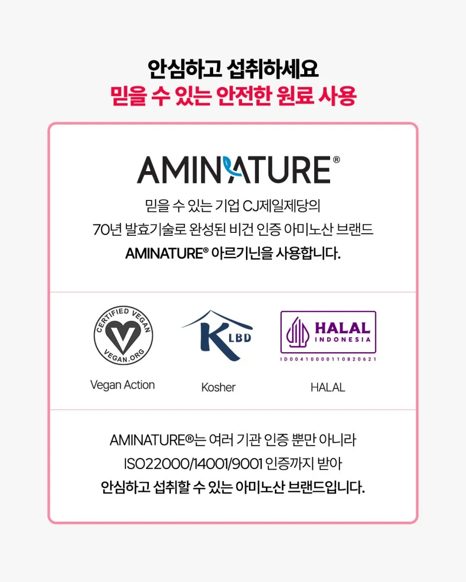 AMINATURE®는 여러 기관 인증뿐만 아니라 ISO22000/14001/9001 인증까지 받아 안심하고 섭취할 수 있는 아미노산 브랜드이다.