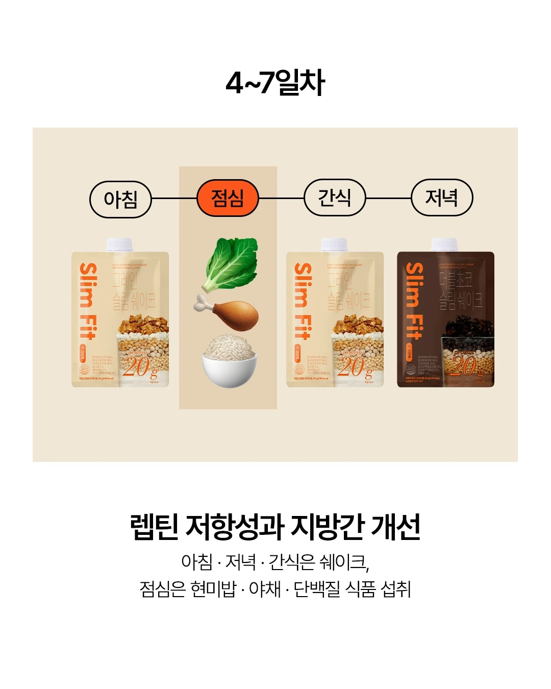 4~7일차: 아침·저녁·간식은 쉐이크, 점심은 현미밥·야채·단백질 식품 섭취