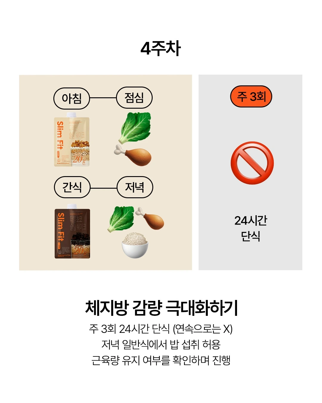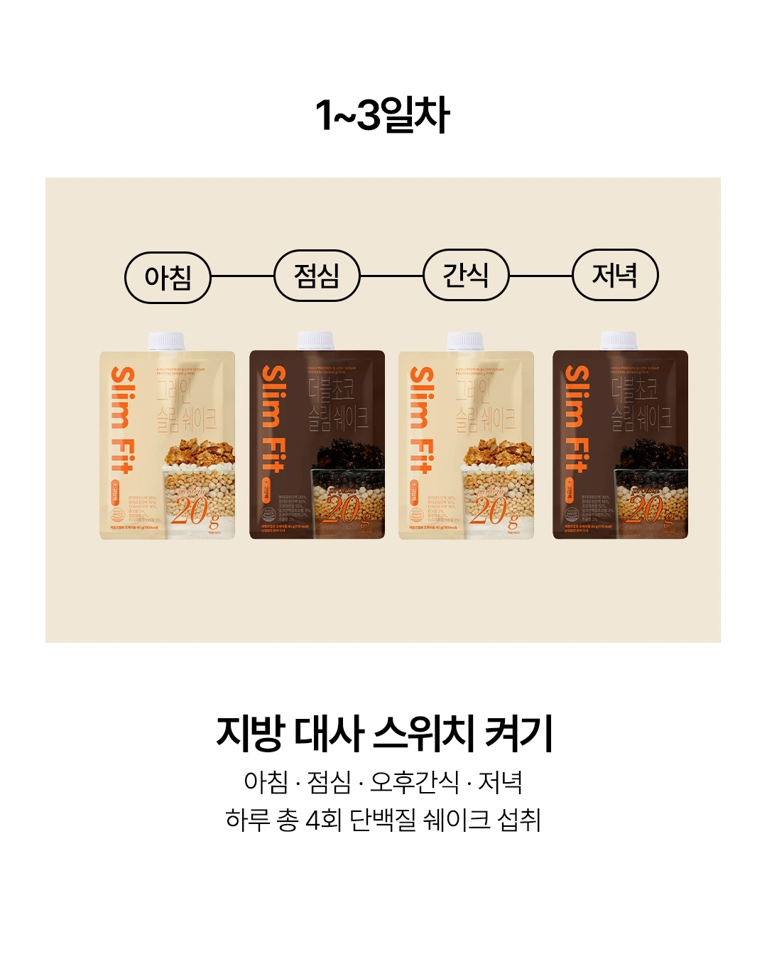 1~3일차: 하루 4회 단백질 쉐이크 섭취