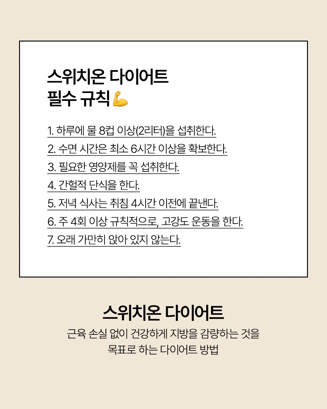 근육은 지키고 체지방만 줄이고 싶다면, 무작정 굶기보다는 대사 구조를 바꾸는 스위치온 방식이 더 효율적인 선택이 될 수 있다.