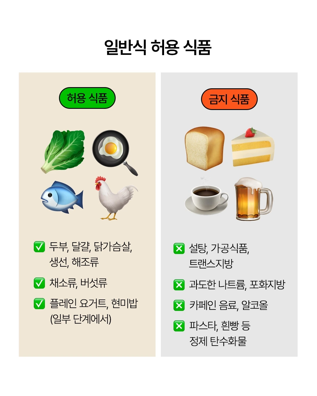 혈당을 급격히 올리거나 지방 대사를 방해하는 식품은 제한된다.