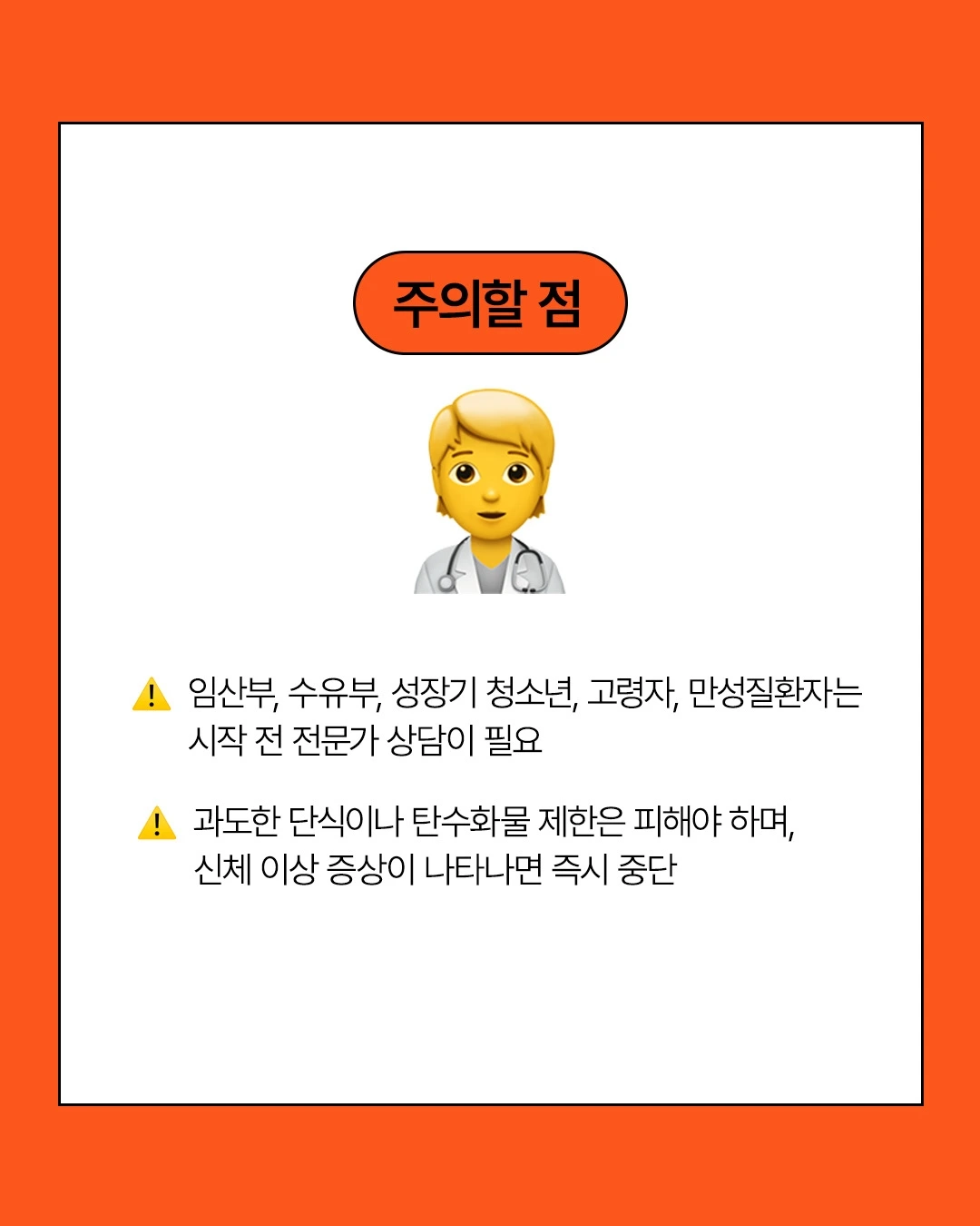 과도한 단식이나 탄수화물 제한은 피해야 하며, 신체 이상 증상이 나타나면 즉시 중단해야 한다.