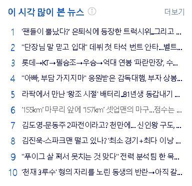 요즘 스포츠 현장기자들은 외부인들로부터 '기레기' 이야기를 지겹게 듣는다. 조회 수에 집착해 뻥튀기된 내용들이 섞여있고, 기자의 추측성 내용이 듬뿍 담긴 글들이 외부로 출고되고 있기 때문이다. 그런데 내용이 어찌됐던, 결국 포장지를 뜯고 싶게 만든 글귀에 주목해볼 필요가 있다. 지난주 네이버 스포츠 야구섹션에 들어가서 본 '이 시각 많이 본 뉴스' 랭킹은 아래와 같다.