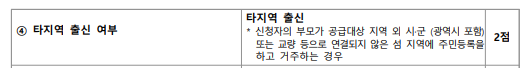 그런데 문제는 위의 그림에 있는 '타지역 출신' 가점이다. 부모가 무주택자인 경우 2점, 부모가 타지역 출신일 경우 추가로 2점을 준다. 나는 나와 부모가 서울에 거주하지만 무주택자이기 때문에 2점이다. 만약 서울이 아닌 곳에 자가가 있는 부모 밑에 있는 지원자가 있다면? 2점이다.
