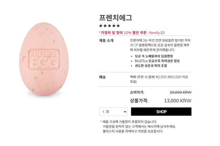 솔티 소다 샴푸바와 같은 브랜드인 아렌시아의 프렌치에그입니다. 역시 온라인가 13,000원이에요. 샴푸바와 마찬가지로 비건 제품인 동시에 제로웨이스트인데요. 홈페이지의 제품 소개를 보면, “비건 천연 원료들만 첨가된 저작극 CP 클렌징 팩으로 모공 깊숙이 클렌징해주며 피부를 매끈하게 관리해준다’고 쓰여있네요.