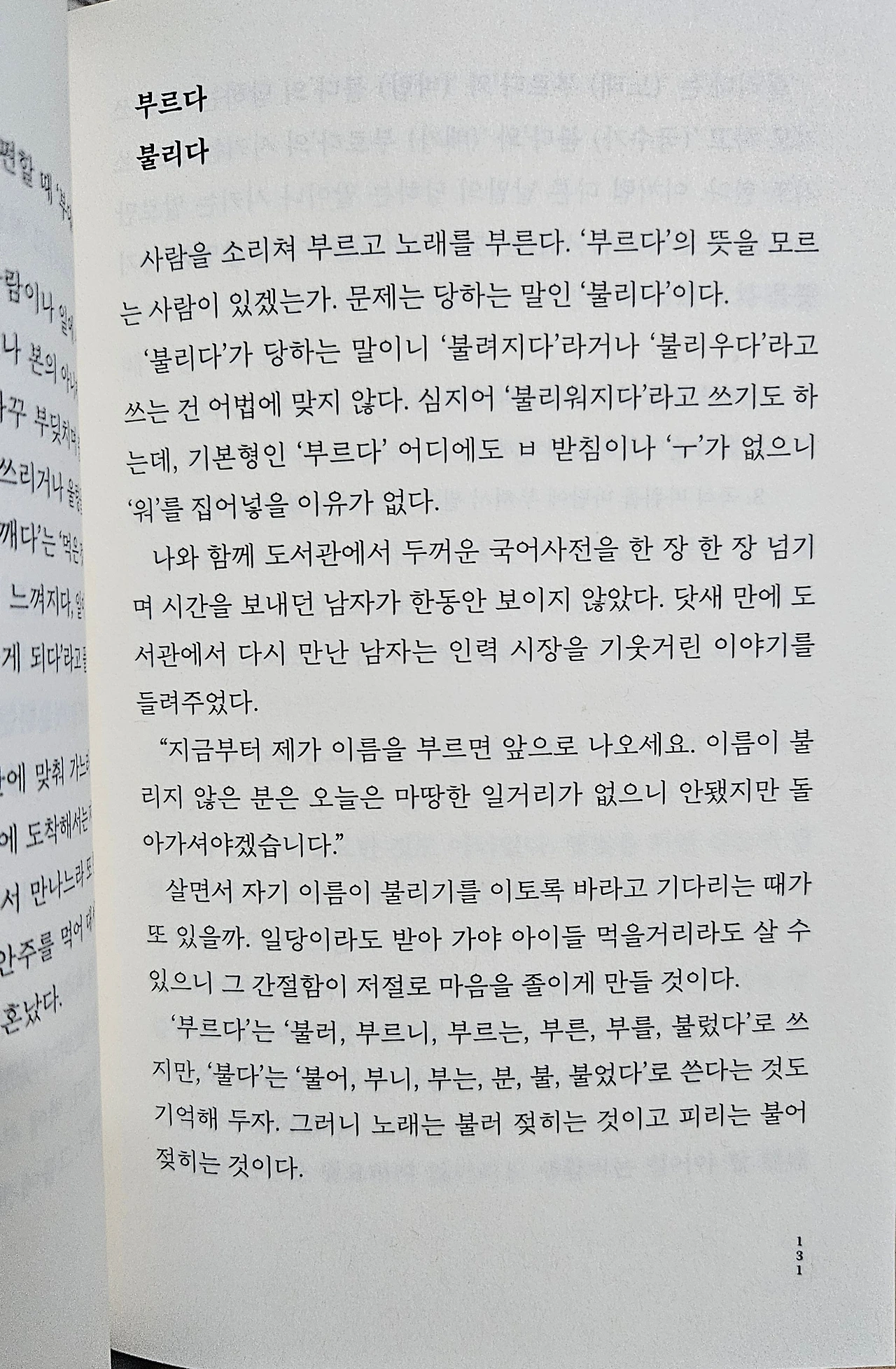 그동안 바빠서 보지 못했던 '동사의 맛'책을 꺼내 들었다. '부르다와 불리다' 페이지에서 마음이 멈춰 섰다. 불리다는 당하는 말이라 한다.