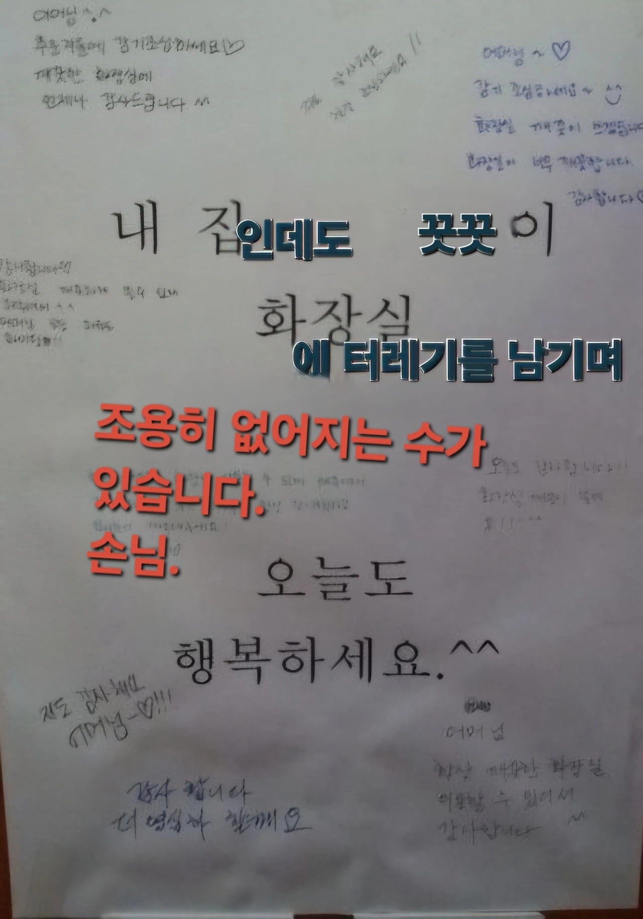 "흠.. 설거지야 네가 아르바이트하는데 제때 안 해서 그런 거고. 니방하고 아빠방은 각자 안 치워서 그렇고. 세면대야 아빠 아침에 면도하고 갔을 때 엄마가 아파서 못 치웠을 때 그런 거고. 엄마 머리야 두통 때문에 머리끈해서 올라가서 그런 거고.."