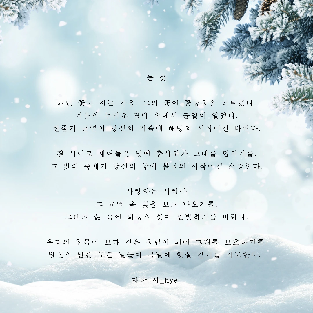 공인인증서 복사도 어려워하는 우리 언니는 이제 알을 깰 준비를 마친 것 같다. 우리 집에서 제일 잘나가던 언니의 모습을 다시 찾길 바란다. 꽃처럼 예쁜 언니가 활짝 피길 바라며 시를 썼다. 언니의 앞날이 봄날의 햇살 같기를 늘 소망한다.