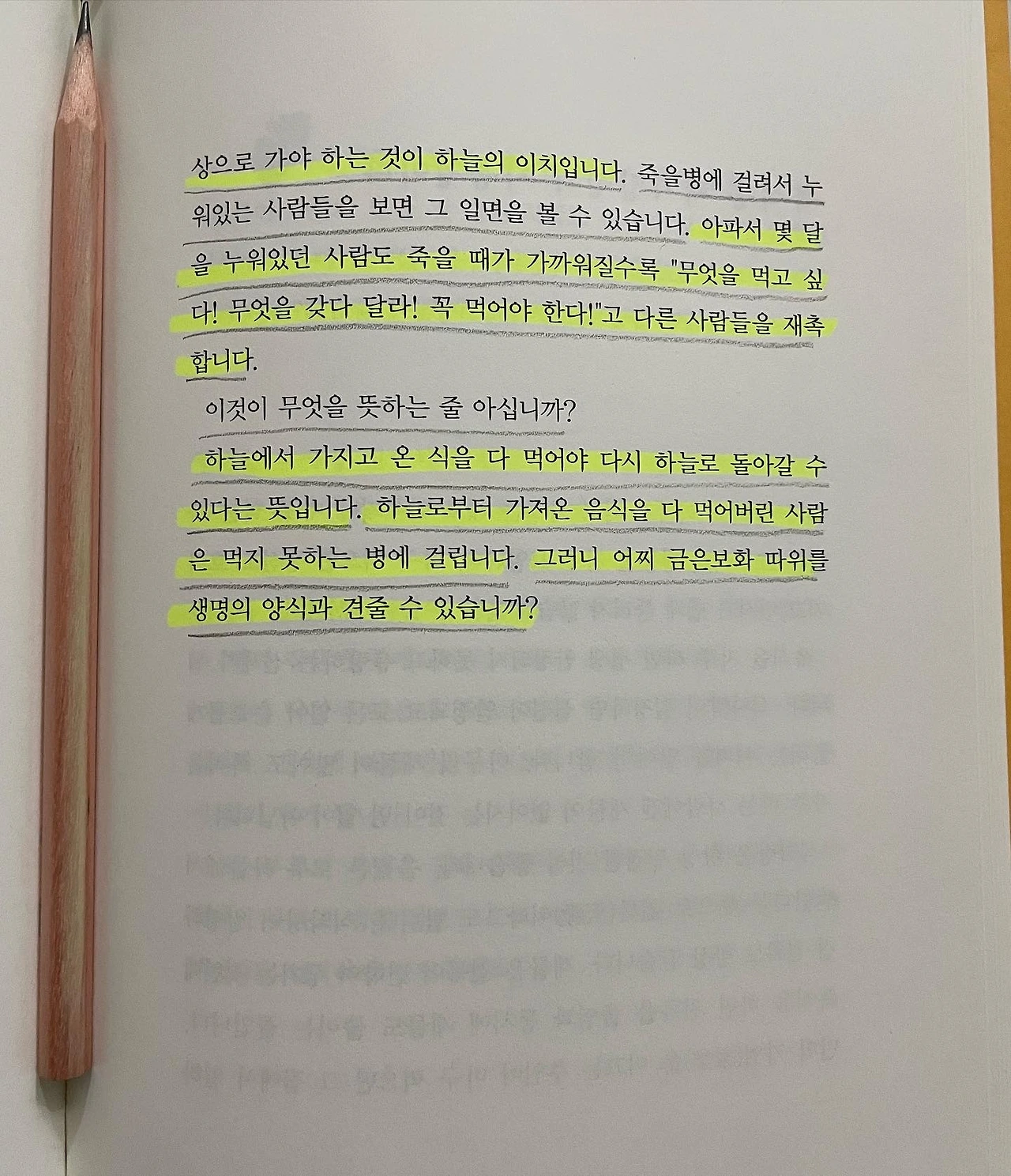 하늘에서 가지고 온 식을 다 먹어야 다시 하늘로 돌아갈 수 있다는 뜻입니다. 하늘로부터 가져온 음식을 다 먹어 버린 사람은 먹지 못하는 병에 걸립니다. 그러니 어찌 금은보화 따위를 생명의 양식과 견줄 수 있습니까?