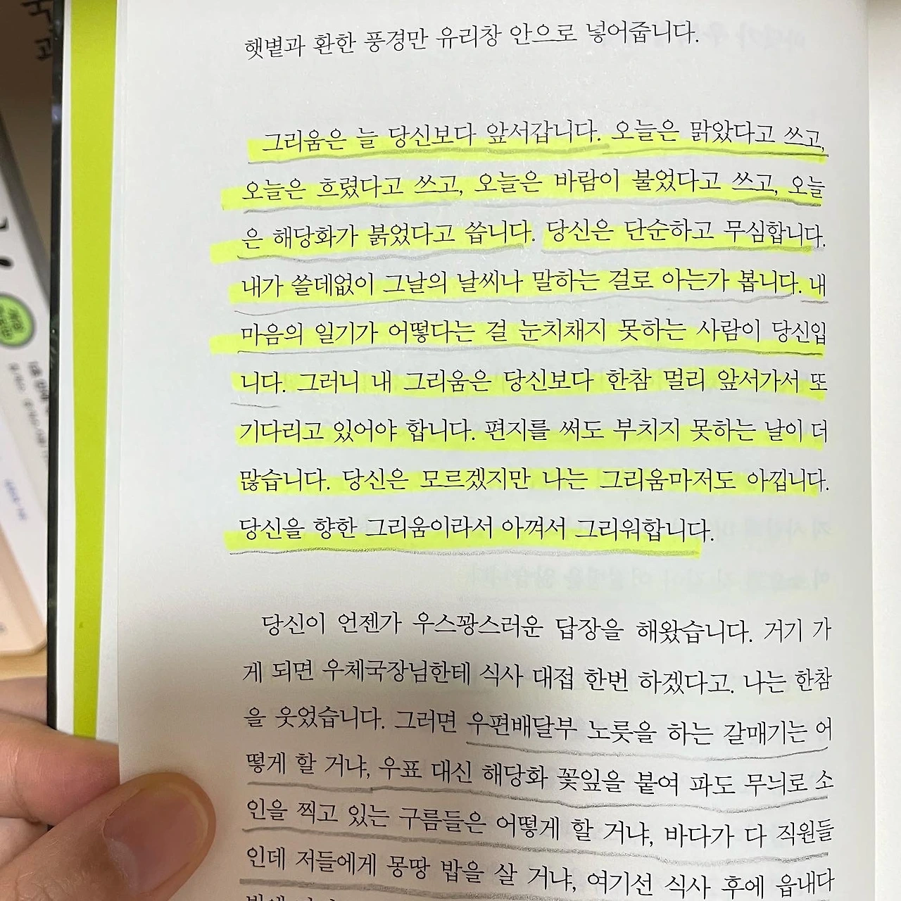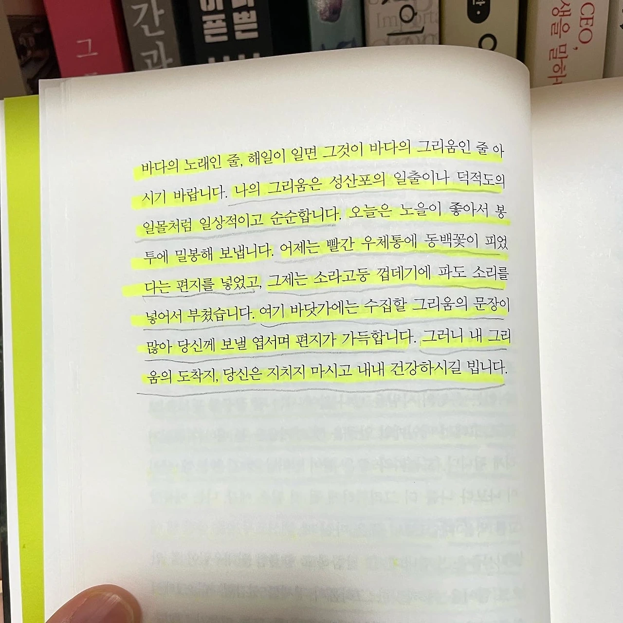 오늘은 노을을 보고 당신을 그리워했고, 어제는 동백꽃을 보고 당신을 생각했습니다. 그제는 소라 껍데기에 마음을 넣어 보낼까 생각도 해봤습니다. 내가 있는 이곳에는 당신에게 보낼 그리움이 아주 많이 남아 있습니다. 그러니 나의 사랑 당신은 무탈히 지내세요. 내가 당신에게 온전히 도착하기까지.