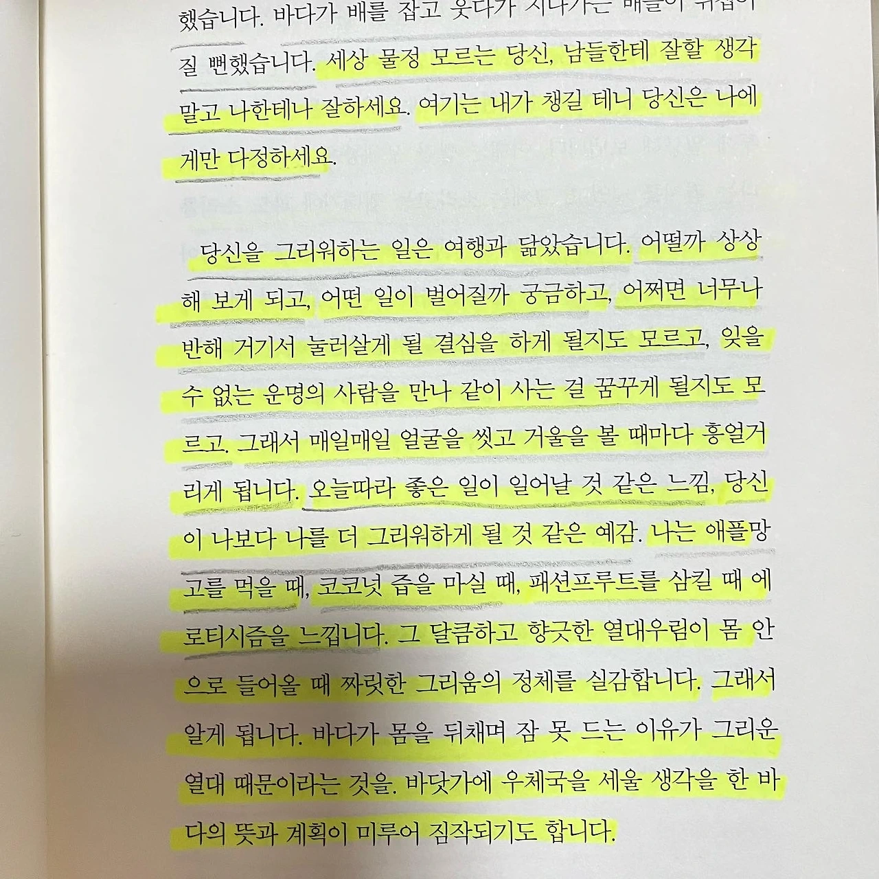 당신을 생각하면 매일이 즐겁습니다. 당신에게 잘 보이고 싶어 매무새를 가꾸고, 한껏 꾸미게 됩니다. 그러고 나면 오늘은 내가 멋있어 보이는 것 같아 기분이 좋습니다. 당신이 나한테 관심이 있을 것 같은 기분. 사실은 당신이 나를 더 좋아할 것 같은 생각. 그럴 때면 나는 행복한 기분을 느낍니다. 내가 좋아하는 열대 과일을 먹는 것만큼 나는 황홀해집니다. 내 마음을 담아둔 바다를 당신에게 보낼 수 없어 나는 몸살을 앓는 것 같습니다. 이 깊은 내 마음을 당신에게 전할 방법이 무엇이 있을까요? 눈이 내리고 비가 오는 날, 파도가 칠 때에도 내가 당신과 같은 하늘 아래 있음을 기억해 줄래요. 당신을 사랑하는 일은 이제 나에겐 일상이 되어버렸으니까요.