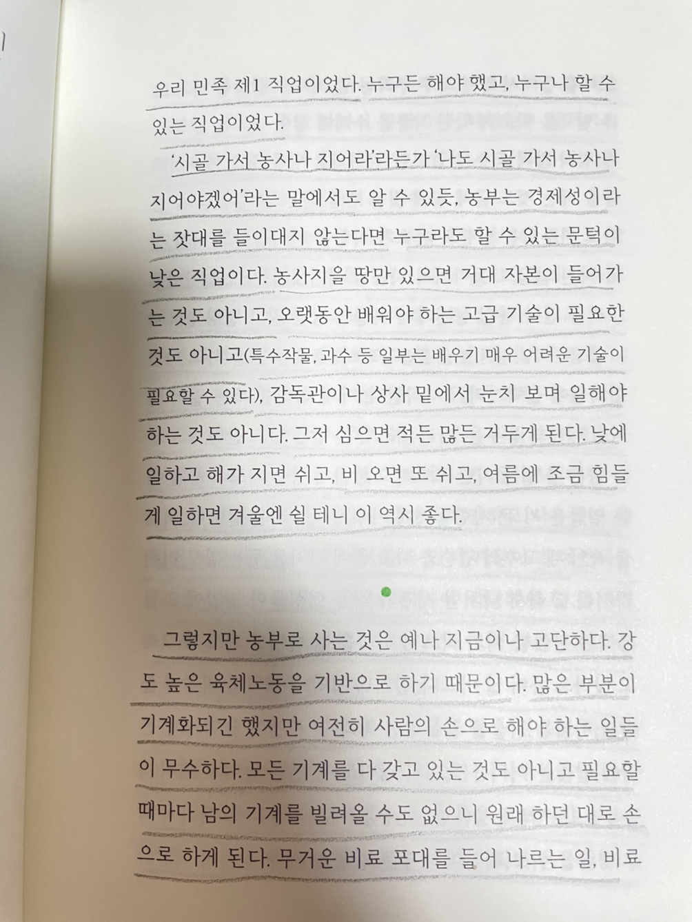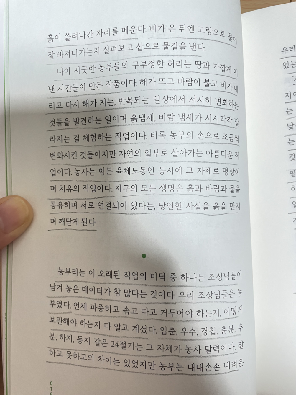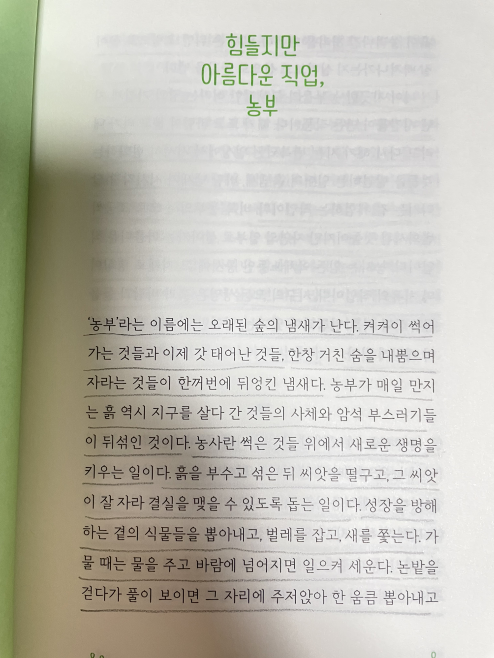 더 읽어 봐야 알겠지만 초반부터 이미 농사를 몇 년은 지은 기분이다. 글이 싱싱하고 푸르다. 독려하고 싶은 문장들이 즐비해서 초반만 읽다 올려본다. 이 열무김치 같은 문장들이 집집마다 밥상에 올라가기를 바라며 말이다.