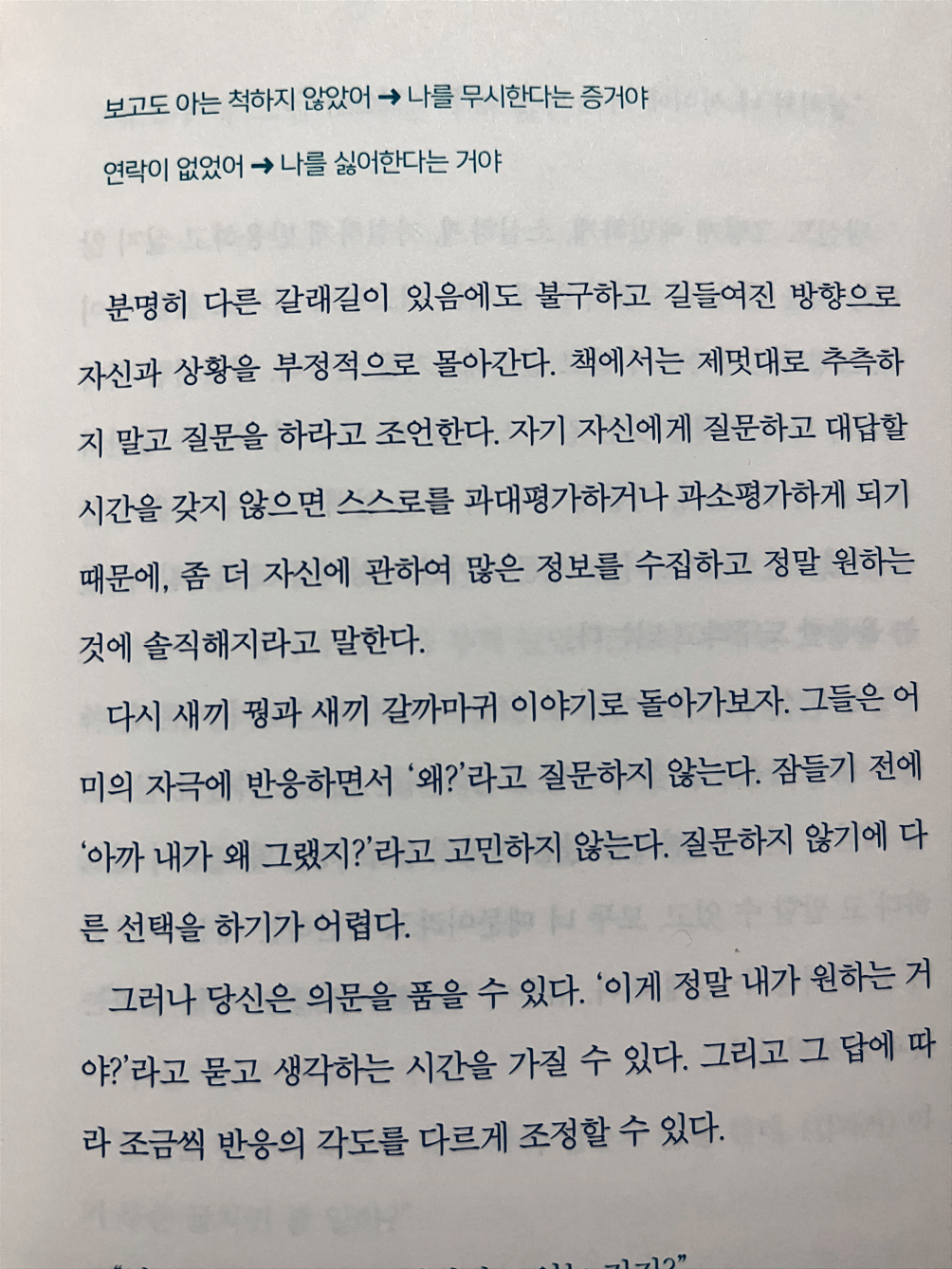 이건 내가 만난 상담사가 한 말이기도 하다. 이 책에 따르면 <깊은 상처를 가져본 사람은 더욱 그렇다. 한번 아파본 사람들은 특수한 유발자극의 상황에 놓였을 때, 상대의 의도나 또 다른 진실을 알기 위해 노력하기보다는 습관적으로 추측하는 경향이 있다.>라고 말하고 있다.