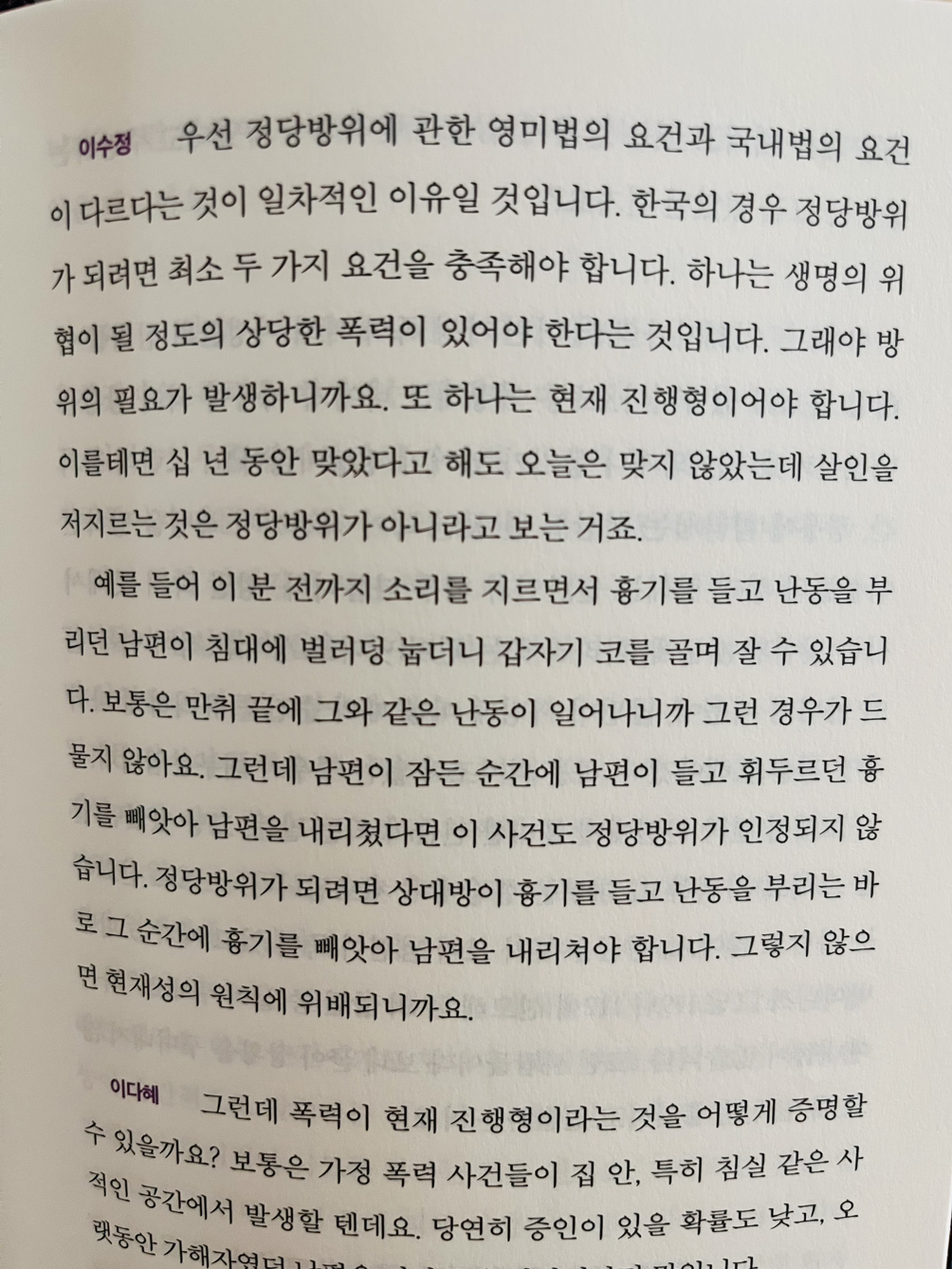 (INFJ) 죽이려고 마음을 먹고 죽이면 안 되지. 피해를 피하려고 하다가 어떻게 하다가 무슨 행동을 갑자기 어쩌다가 했는데 그 사람이 어라라, 어이쿠, 어쩌다보니 죽은 거면 정상참작될 수도 있겠지만 나한테 피해를 줘? 저 새끼를 내가 지금 죽인다, 라는 마인드로 하면 안 돼.