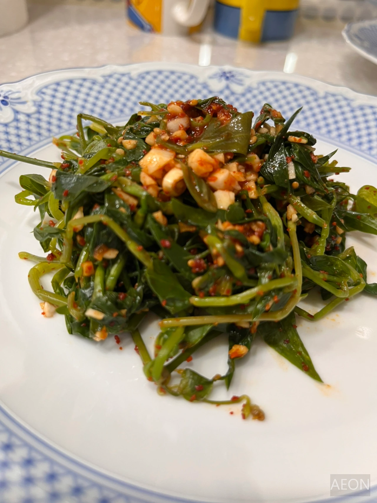 돌나물은 내가 청소년 시기에도 즐겨 먹던 반찬이었다. 나는 주택 살이가 처음이 아닌데 (남편은 처음, 그러므로 주택 생활은 내가 선배다) 고등학교 때에도 마당이 있는 주택에 살았다. 그때도 돌나물은 돌나물이라는 이름답게 돌 근처에서 쉽게 볼 수 있었는데 흙이 많은 마당 가운데에선 볼 수 없었고 마당 끝 돌이 많은 곳에서 채취할 수 있었다. 가끔 '돈나물'로 잘못 불리기도 하지만 정확한 이름은 돌나물이다. 영국에 살았던 십여년동안은 먹어본 적이 없고 한국에 돌아와서도 마트에서 본 기억이 없어서 정말 오랜만에 먹어본 추억의 식재료였다. 그러니까 함부로 밟고 다니지 말라고 남편아.
