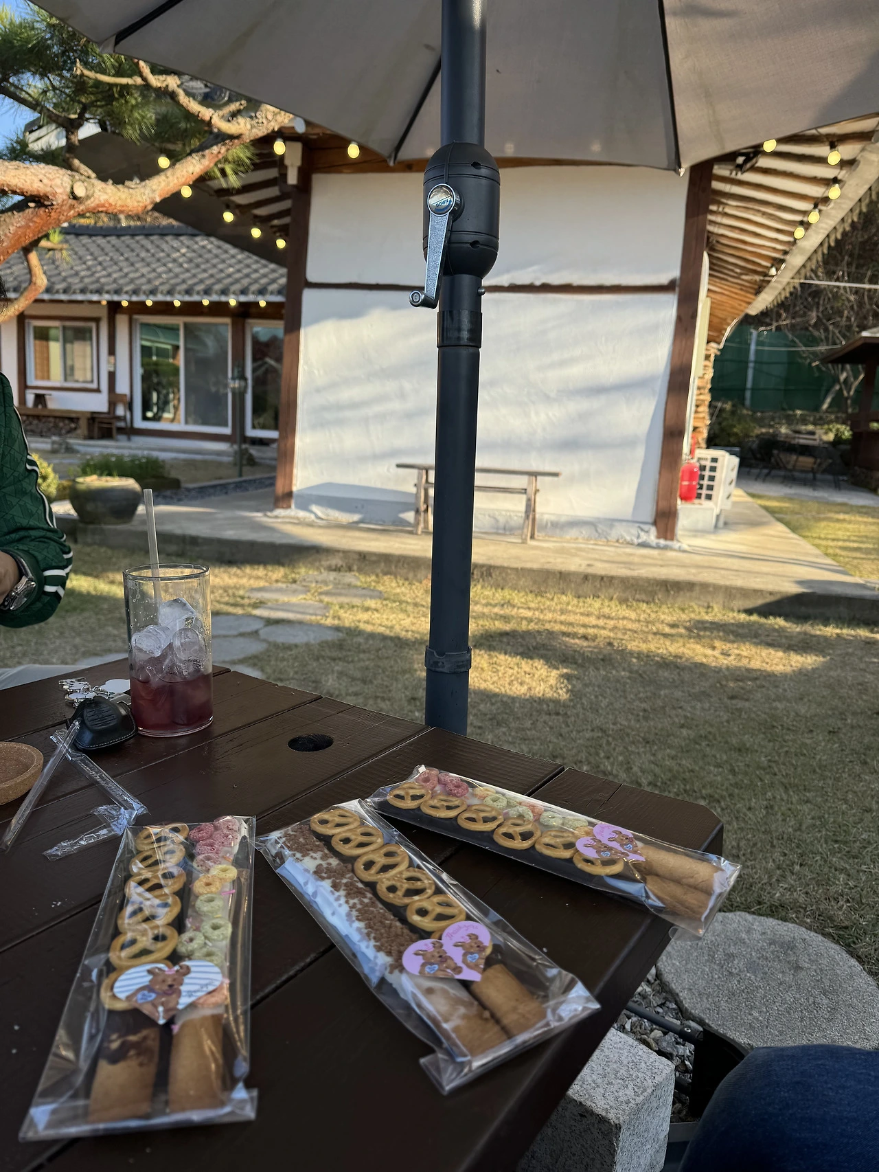 이곳 장날은 9일이라 9, 19, 29일에 장날 꽈배기를 맛볼 수 있다. 김장할머니 말고 저기 위 쪽에 사시는 음악을 하신다는 단골 손님이 장에 다녀왔다며 꽈배기를 한 봉지 갖다주신 적도 있다. 따뜻할 때 먹어야 맛있는데 손님이 몰려와 계속 못 먹다가 조금 여유가 생겨 꽈배기 봉지를 들고 야외테이블에 앉았다. 실내테이블에 앉아있던 유치원생 이란성쌍둥이 손님이 다다다다 뛰어와서 내 옆에 앉는다.