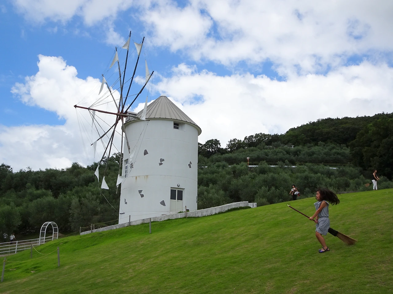 지중해도 아니고 일본에 왠 올리브냐 싶지만 쇼도시마엔 정말로 올리브 나무가 자란다. 그것도 아주 많이. 여기에 쇼도시마와 자매 결연을 맺은 그리스의 밀로스 섬에서 기증했다는 하얀 풍차까지 더해지니 정말 여기가 일본이 맞나? 하는 느낌이 들게 했다. <마녀 배달부 키키>의 배경이 된 실사 장소 중 한 곳이 이 풍차여서, 풍차 앞에는 조금 우습게도 빗자루를 가랑이 사이에 끼고 '점프샷'을 찍는 사람들로 붐비고 있었다. 이 점만 제외한다면 이 곳은 <알프스 소녀 하이디>나 <플란다스의 개>가 더 떠오를 법한 분위기였다. 푸른 들판과 하늘, 하얀 풍차와 구름이 멋지게 한쌍을 이루는 풍경. 아무튼 나오시마에서 만났던 아저씨가 전했던 "쇼도시마에서는 올리브가 주렁주렁 열리고 언덕 위에선 풍차가 돌아간다"는 말은 있는 그대로 모두 사실이었던 것이다.