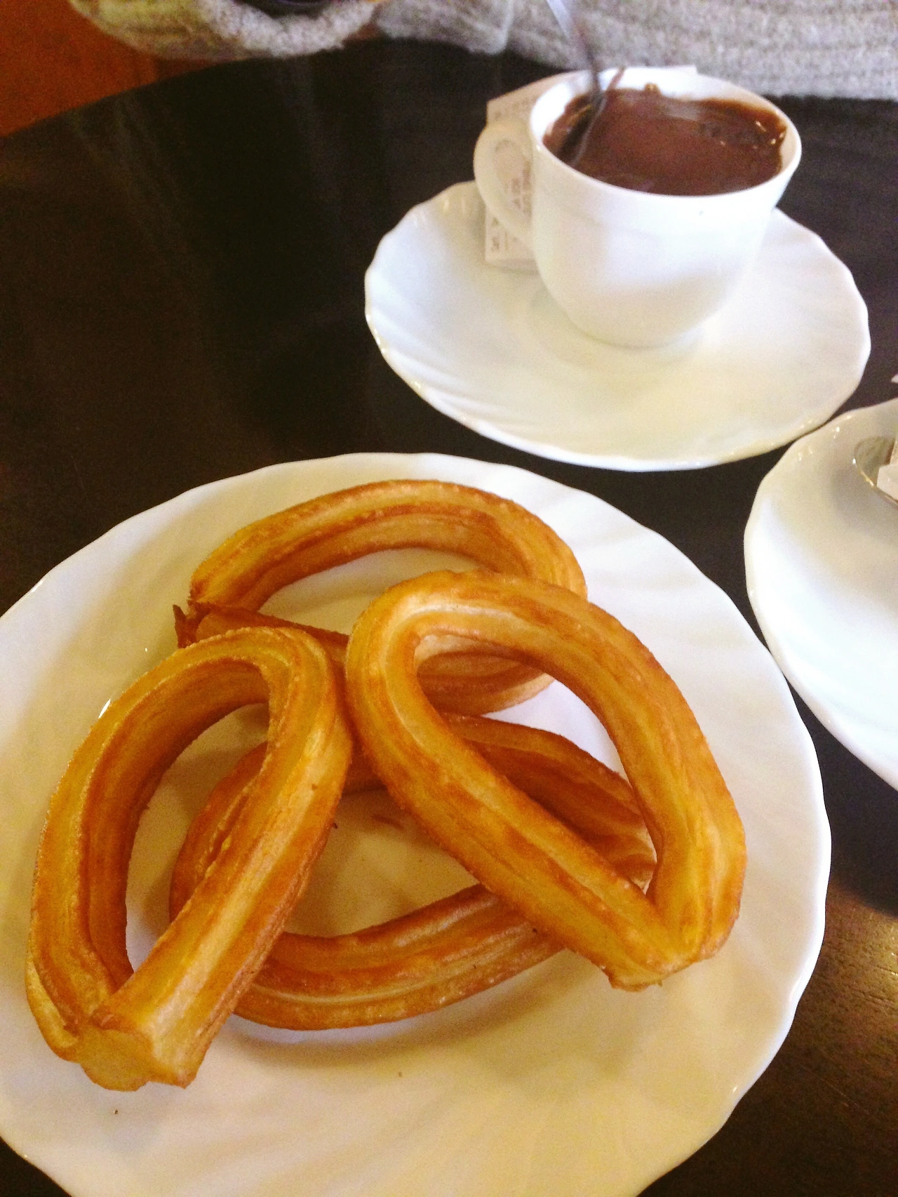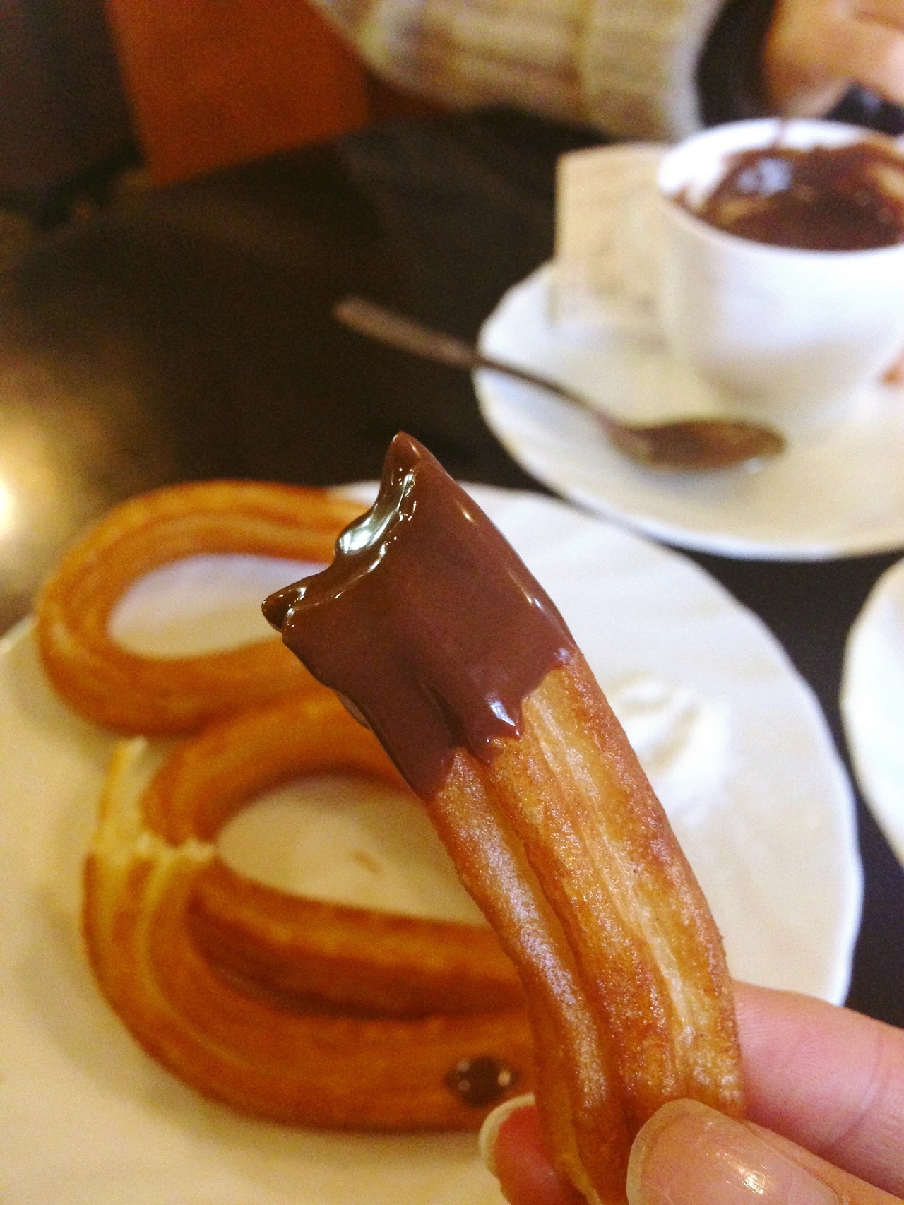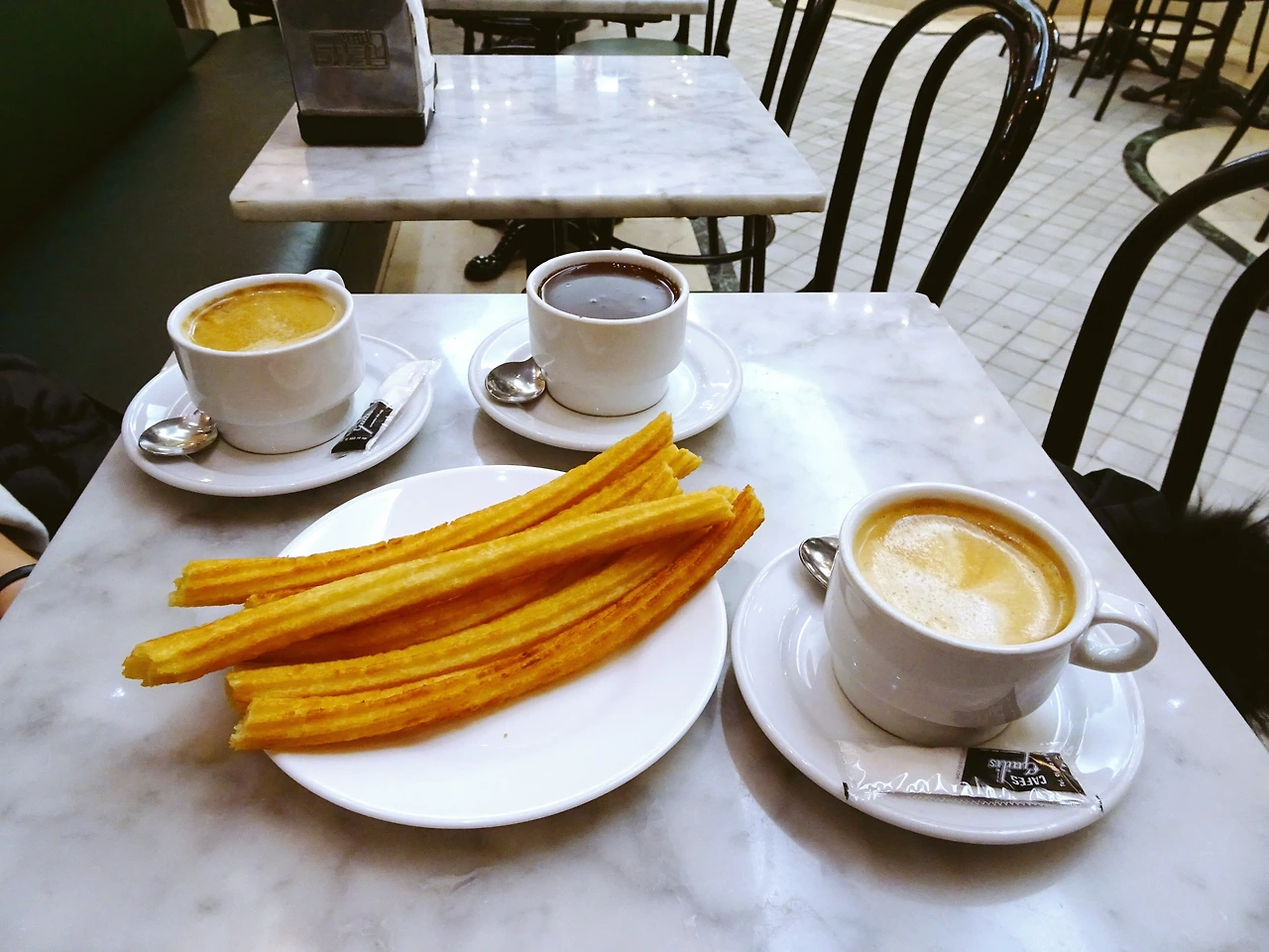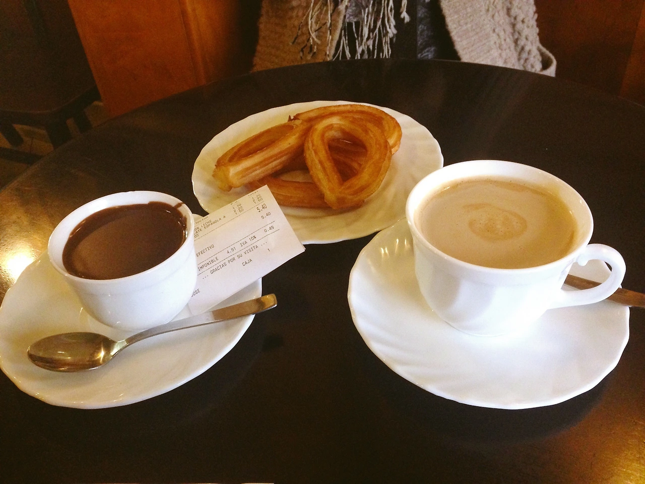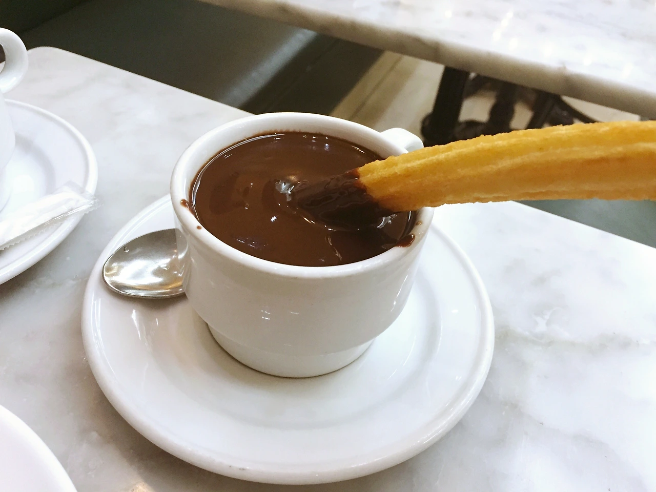 스페인에서 츄러스는 주로 아침 식사 거리. 핫 초코와 함께 하는 경우가 많은데 이 핫 초코는 말이 핫 초코일 뿐 엄청나게 꾸덕한 식감으로 거의 액상 초콜릿에 가깝다. 물에 가루를 탄게 아니라, 고체 초콜릿에 열을 가해 녹인 정도의 느낌이라 후루룩하고 마실 수는 없는 진한 농도다. 퍼먹기 위한 스푼은 필수!
