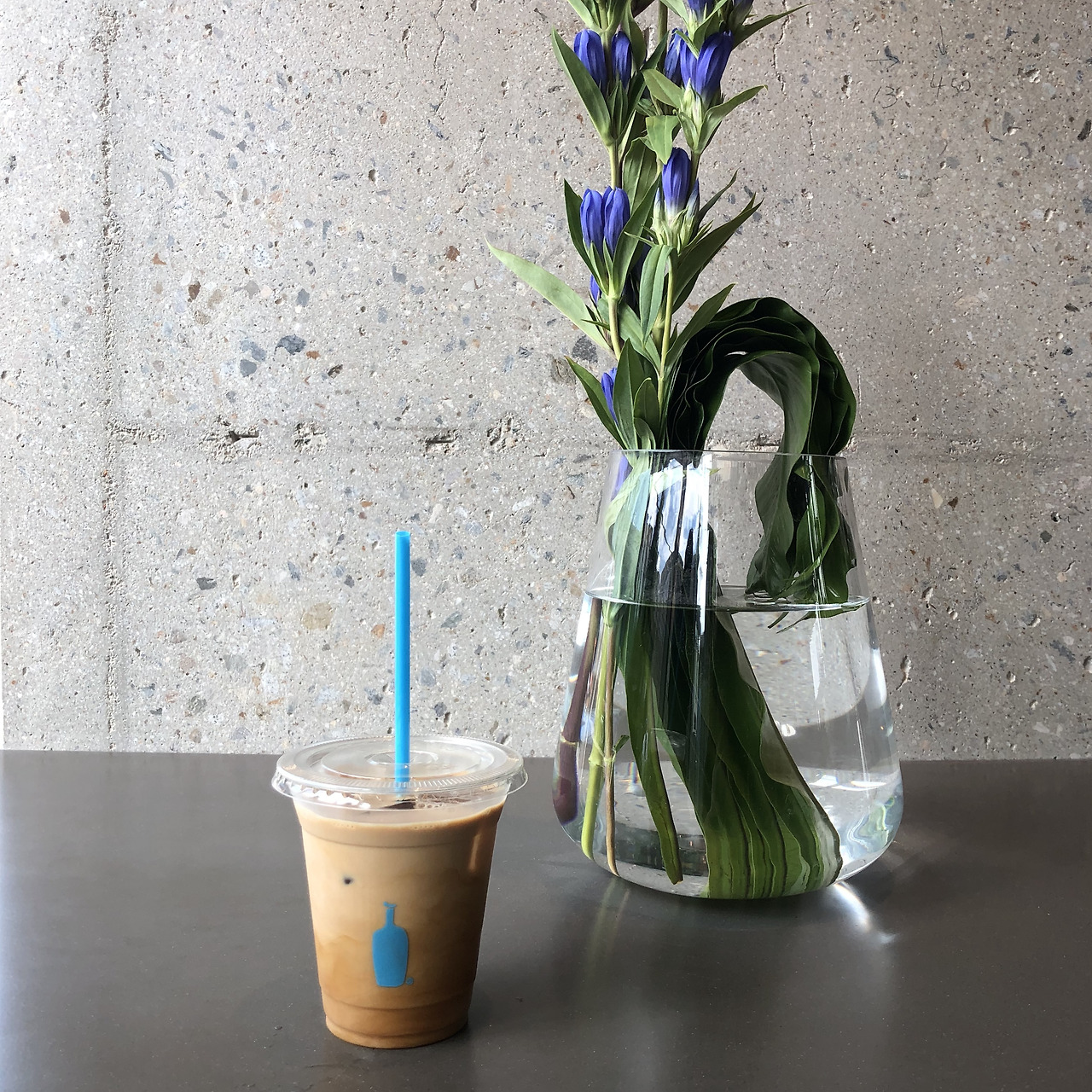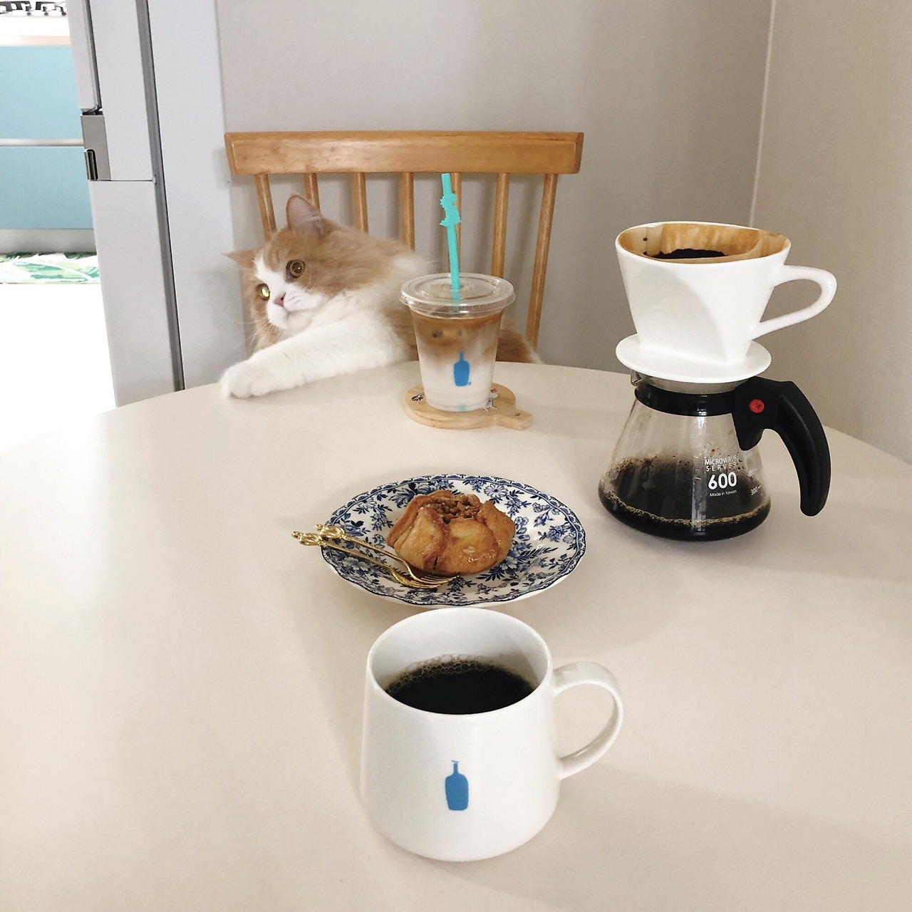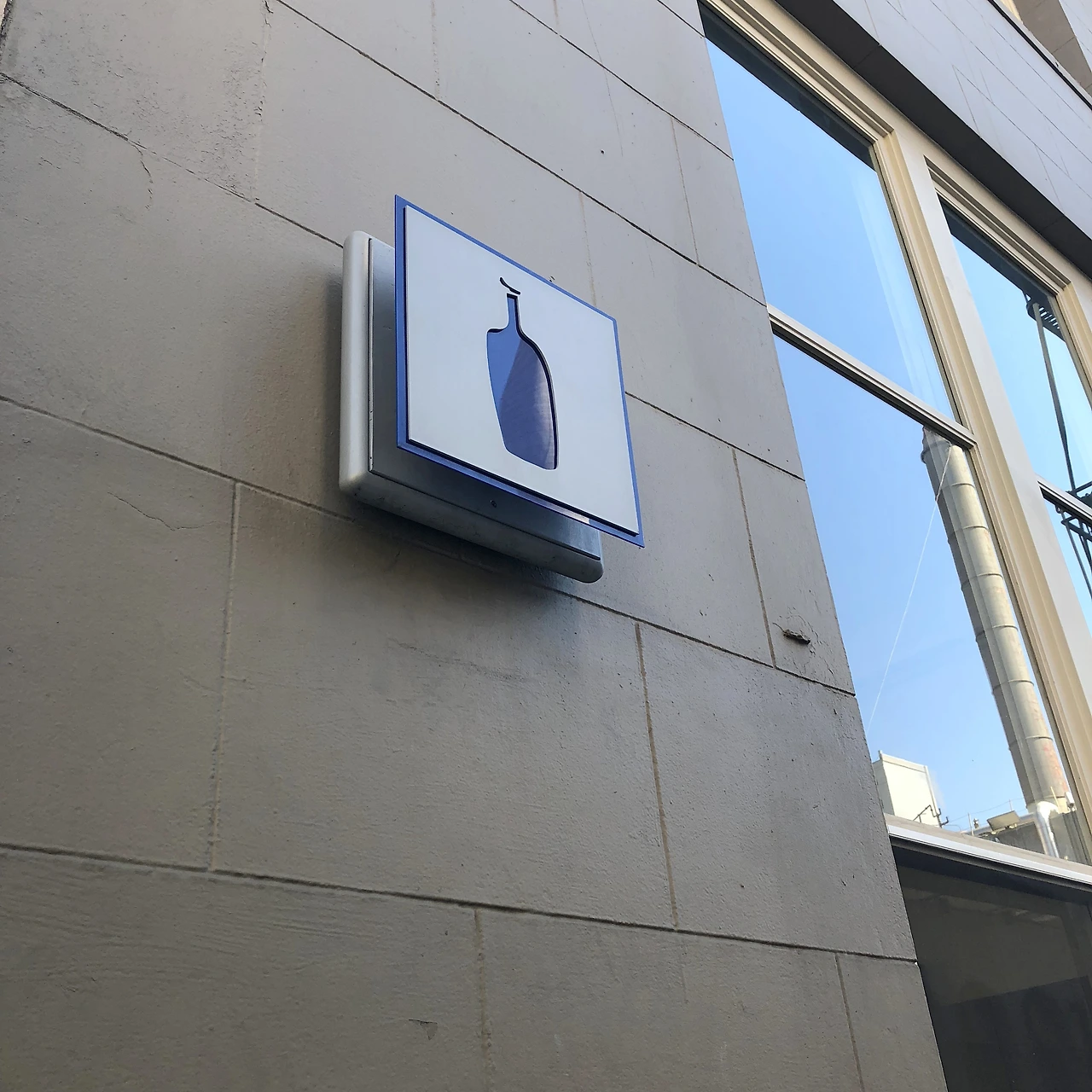 간판이나 가게가 잘 눈에 띄지 않아서 근처까지 와놓고는 약간 헤맸다. 큰 길가에 내놓은 입간판은 바로 눈에 띄었는데 정작 가게 입구가 어디인지를 발견 못해서 불나방처럼 그 근처만 빙빙. 나중에 깨닫고보니 시야 바깥의 높은 위치에 조그만 간판이 걸려있었다. 이건 내 키의 문제가 아니라 누구에게나 시야 바깥일 만한 높이였다. 흰 바탕에 손으로 대강 슥슥 그린 듯한 파란 물병. 틀림없는 블루보틀이다.