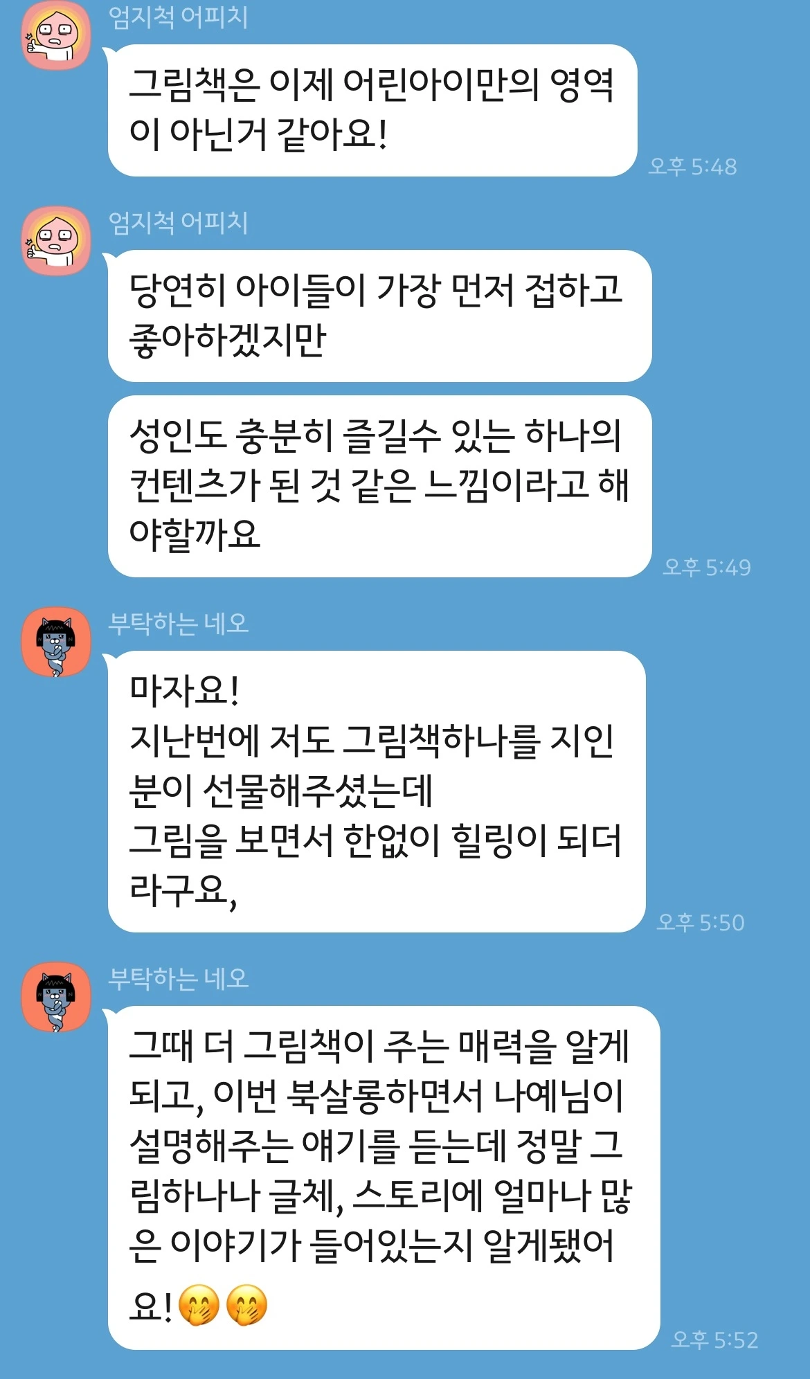 성인들이 그림책을 셀프로 펼치기는 쉽지 않습니다. 생각보다 기회가 없거든요. 그치만 누군가 펼쳐서 코 앞에 들이밀어드리면 다들 무척이나 좋아하세요ㅎㅎ 그림책을 펼쳐서 코 앞에 들이밀어드리는 일을 시작한지도 벌써 3개월이 넘어가네요.