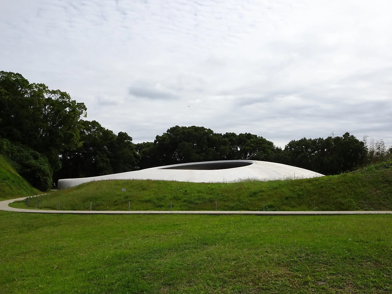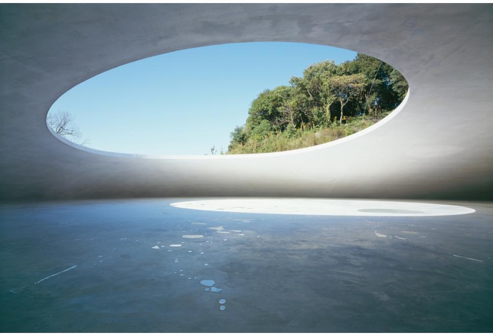 물방울을 닮은 듯, 이글루를 닮은 듯, 둥글둥글한 모습의 데시마 미술관. 주위의 야트막한 언덕과 잘 어울리는 듯 아닌 듯 아리송한 모습이다. 분명 형태상으론 이질감이 없는데 온통 푸릇푸릇한 언덕 가운데 흰 돌덩이가 덩그러니 놓여 있는 느낌이라 묘한 인상을 준다. 게다가 구멍이 뻥 뚫린 돌덩이라니, 납작한 도자기 같기도 하고 커다란 단추 같기도 하다.